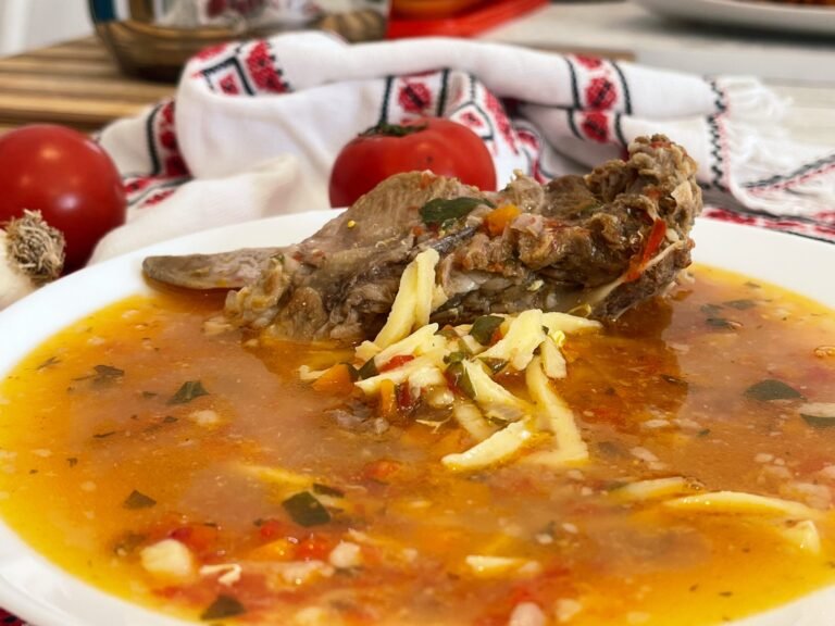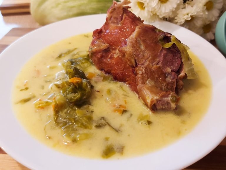 Soup with smoked pork knuckle, fresh vegetables, and sour cream – a perfect recipe for cold winter days, tasty and easy to make at home!