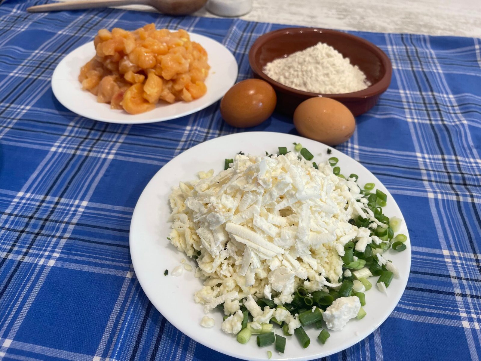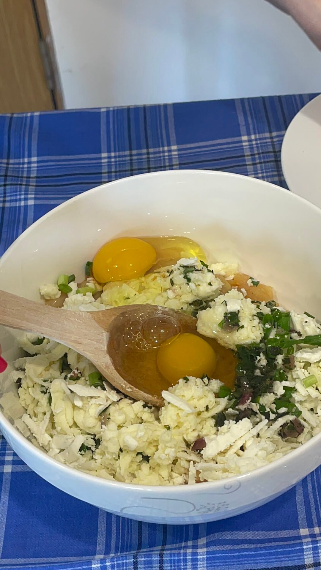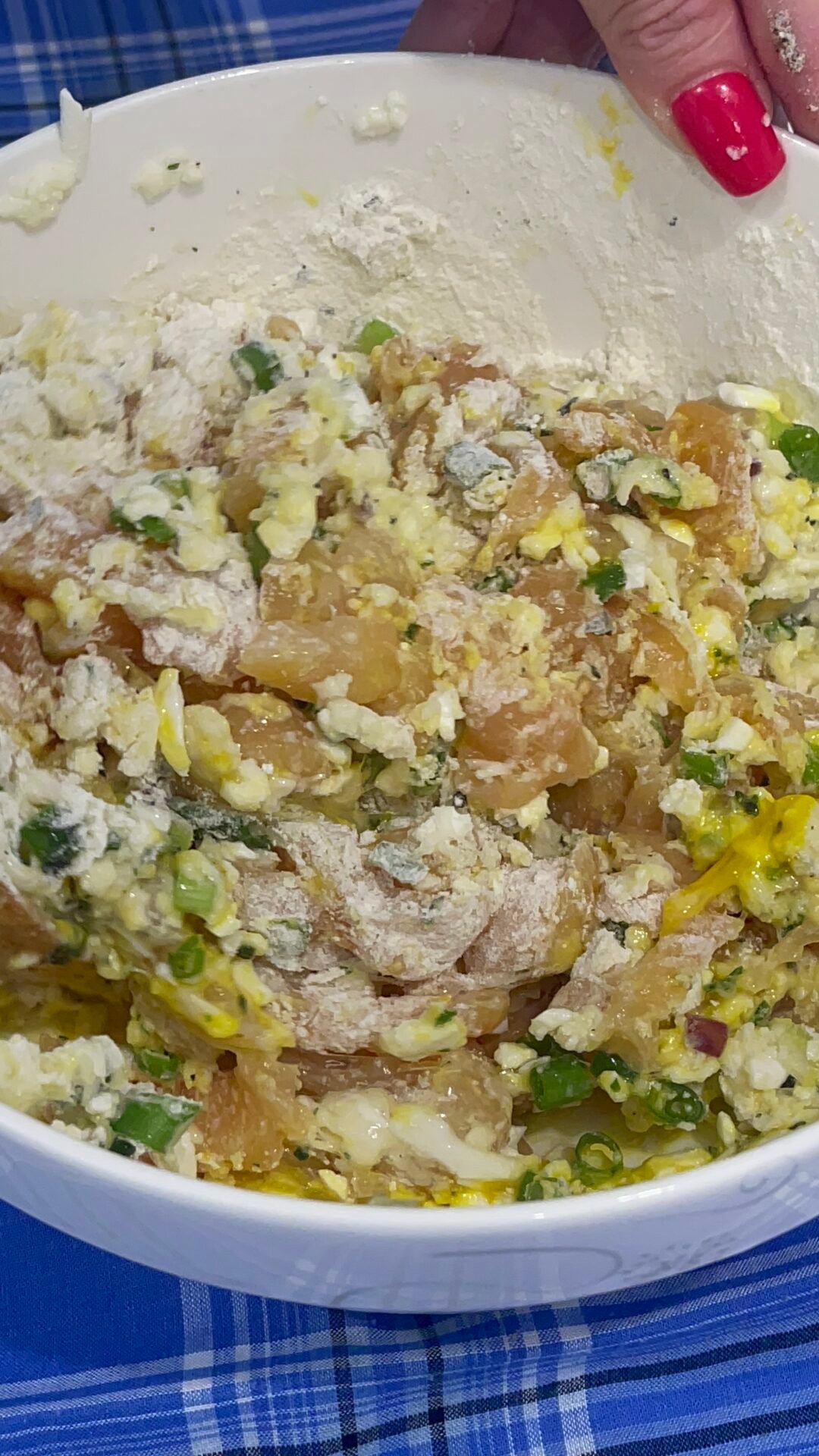 - In a large bowl, add all the ingredients one by one and mix well. Season with salt and pepper, being careful not to overdo it if you use salty cheeses. Because we have raw chicken in the composition, it would be better to taste it after frying and add more seasoning if necessary.