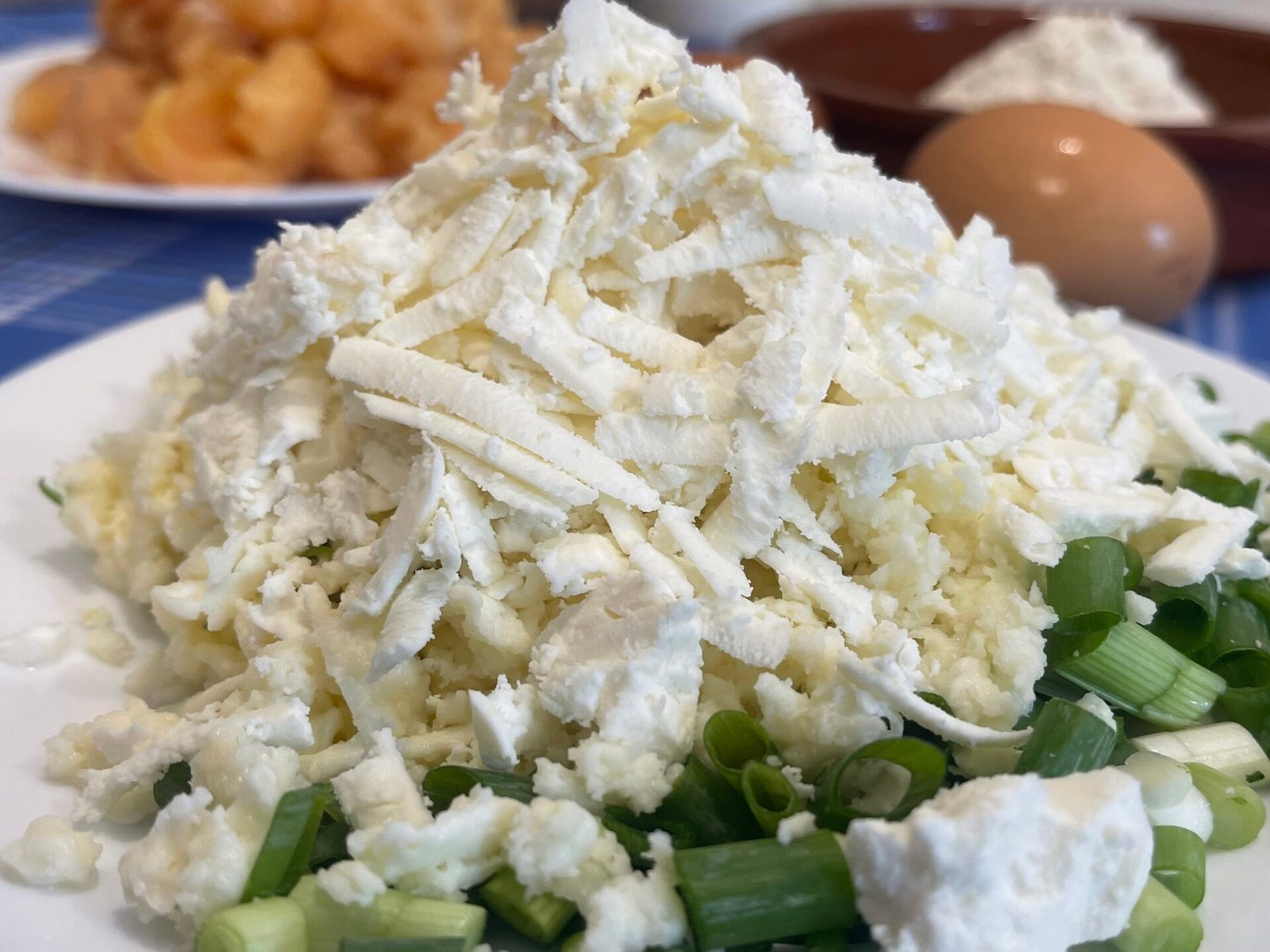 - With the help of a sharp knife, I cut the chicken breast into very small cubes. I did the same with the mozzarella, and grated the goat cheese. If you use fresh herbs, chop them finely as well. Apart from green onions, I used frozen herbs.