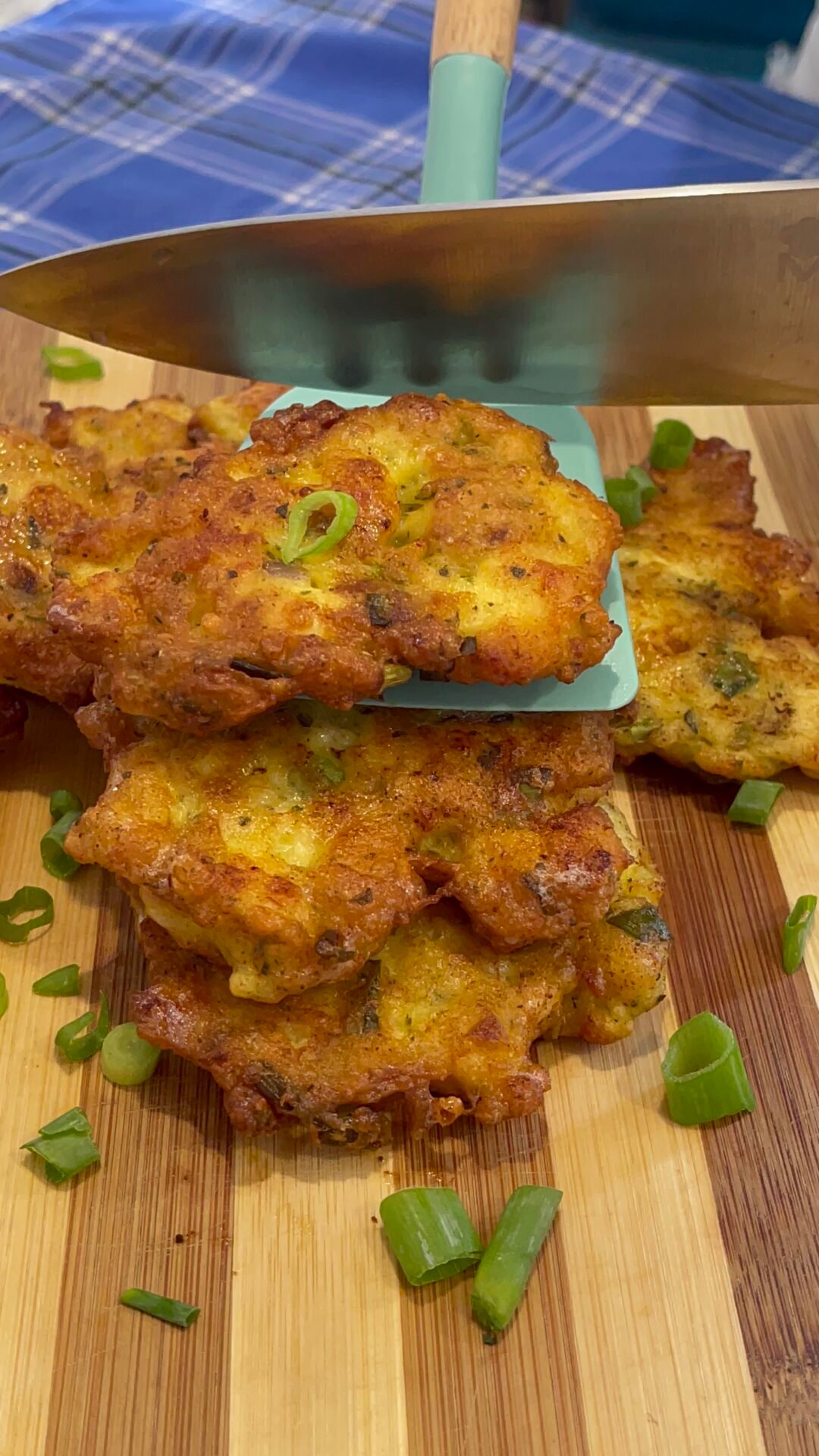 - Serve the cheesy chicken while it is warm and hot. I was planning to make potato wedges and garlic sauce on the side, but these fritters were eaten as soon as I took them out of the pan. Maybe you will have more success! Enjoy!