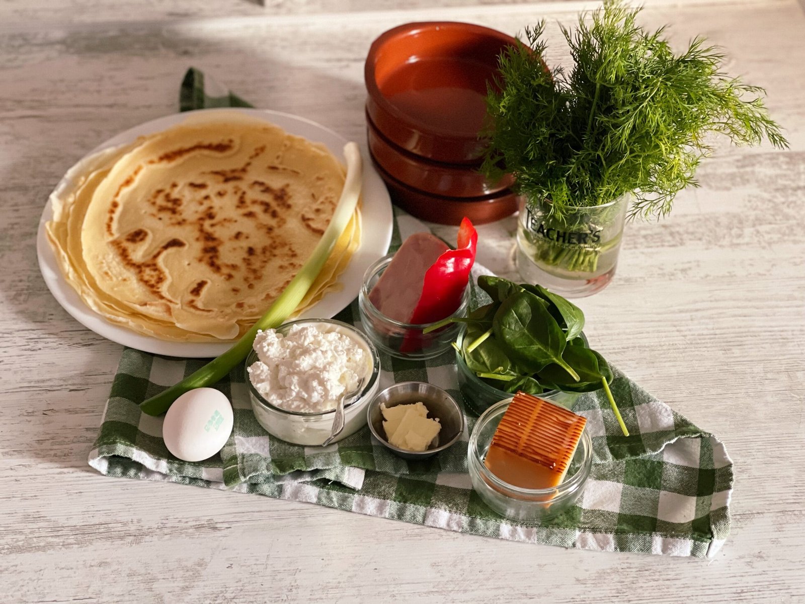 • To start, I chopped the green onion, dill, and a piece of pepper. I finely grated the cheese and cut the chicken ham into thin strips. In a pan, I lightly sautéed the green onion in a little butter, for 2-3 minutes, then added the spinach at the end. I didn’t cook it for more than 1 minute—that was enough.