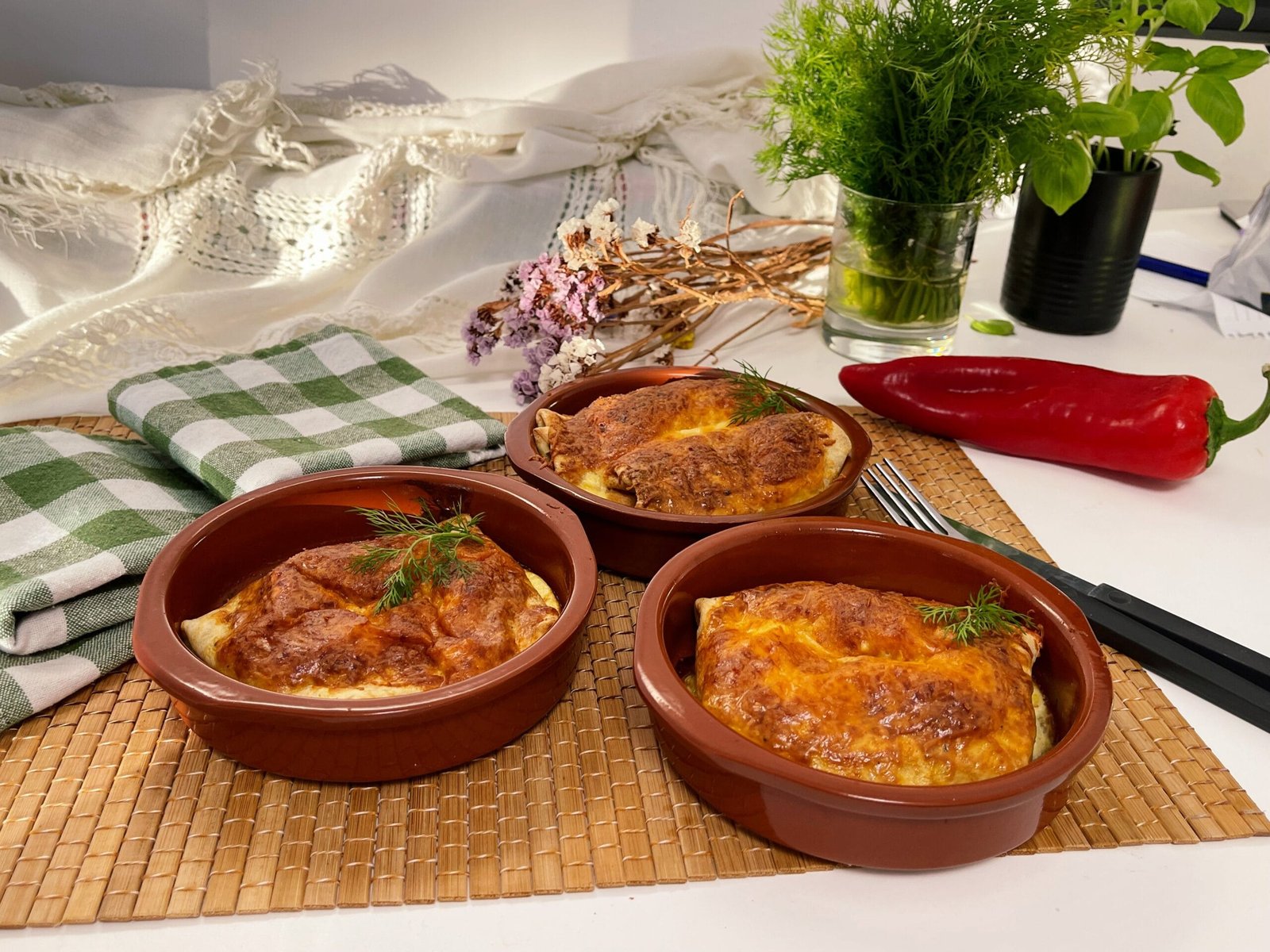 • I filled each pancake with 2 full spoons of the prepared mixture. I made sure to wrap each pancake tightly so that the filling wouldn’t spill out during baking. Since I wanted to prepare individual portions, I used 3 small ceramic dishes for baking. This step isn’t necessary—you can use any tray or dish you prefer. I greased the dishes with a little oil and placed the cheesy pancakes in them.