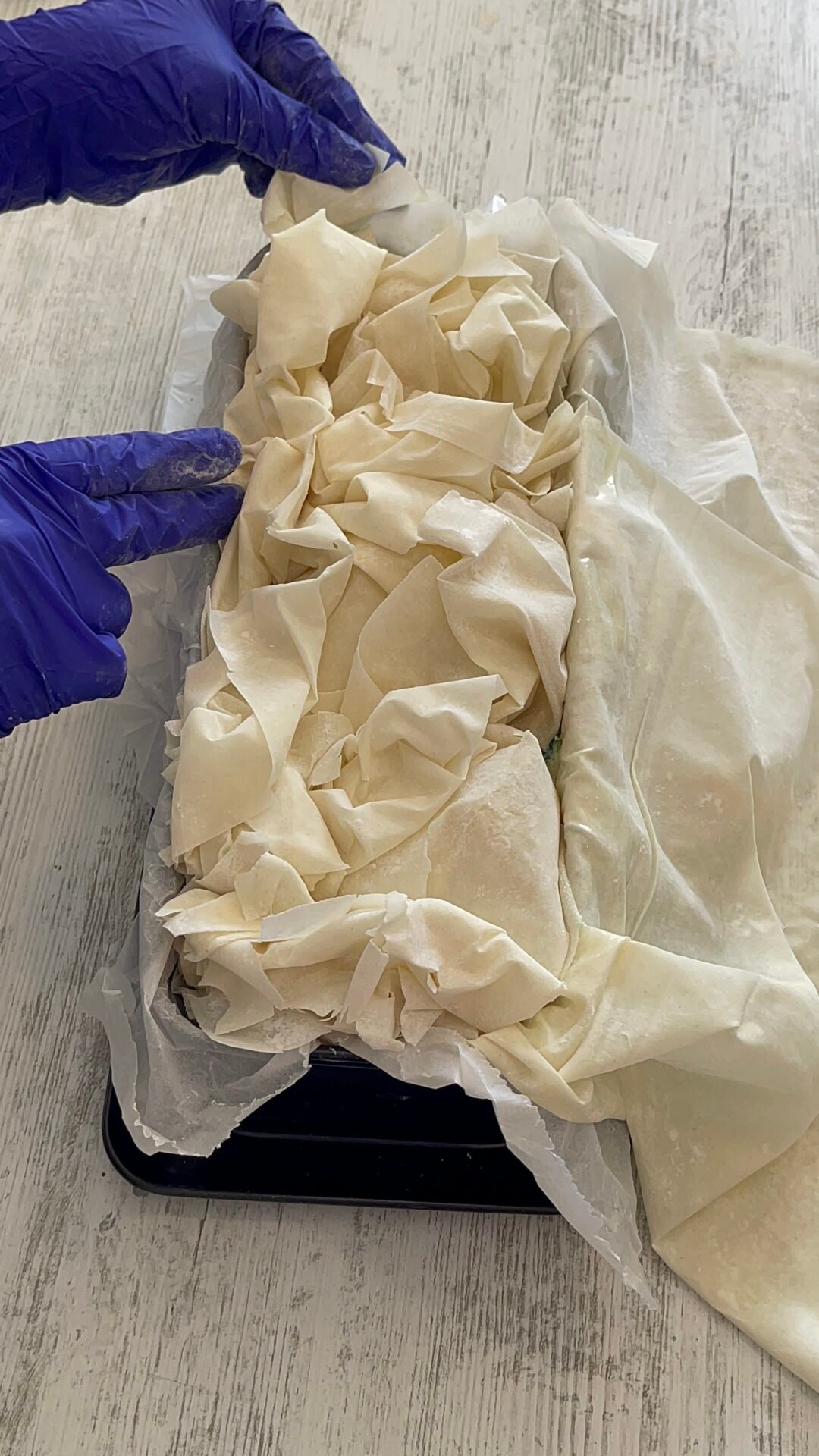 - I added the last remaining sheets on top, also wrinkled, and then we lifted the sheets from the edge of the tray one by one, bringing them to the center. Grease with the rest of the remaining butter and put the pie in the oven for about 40-45 minutes. If it seems to you that it browns too quickly on top, add a baking paper and continue to bake it for the remaining time.