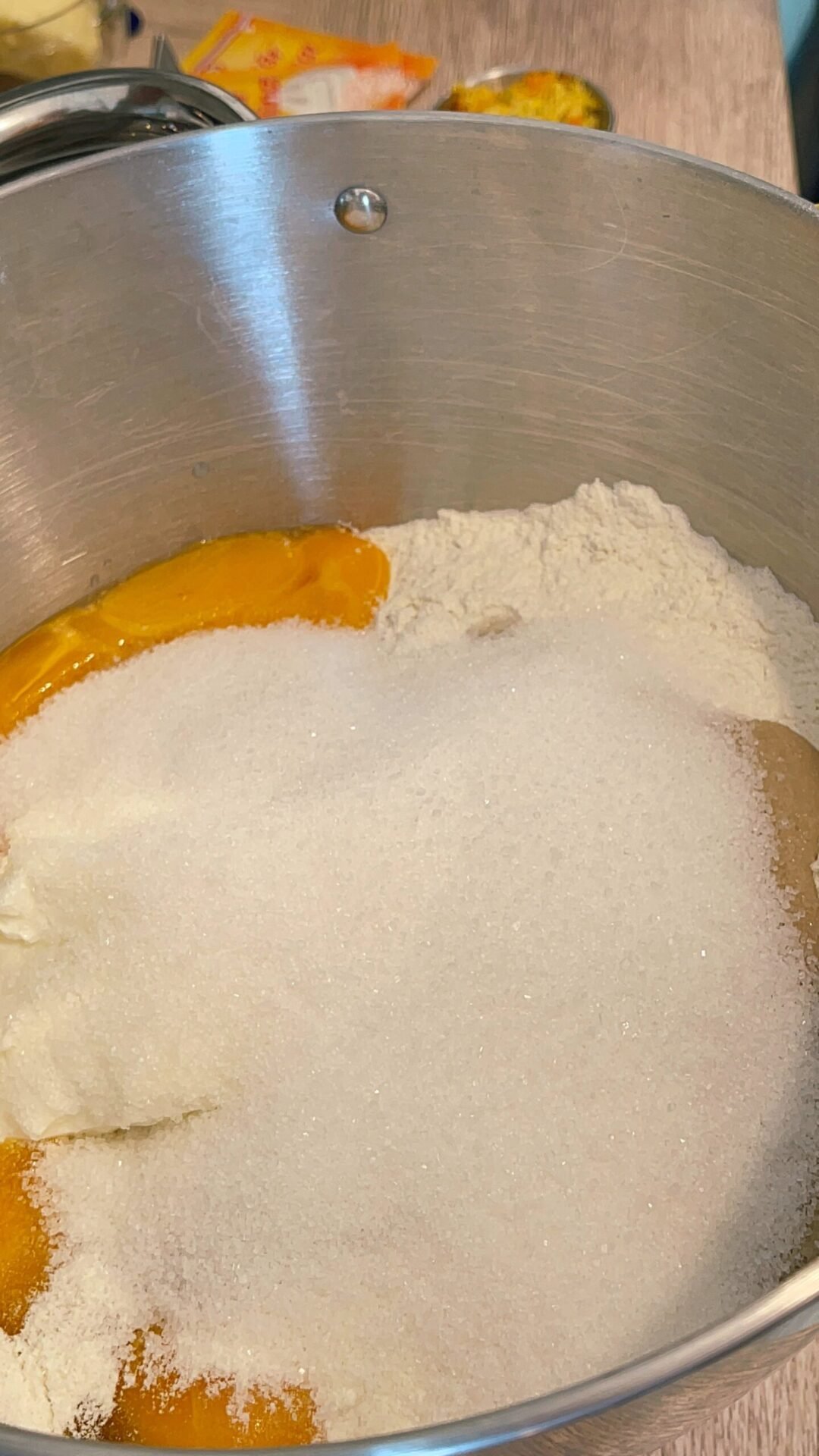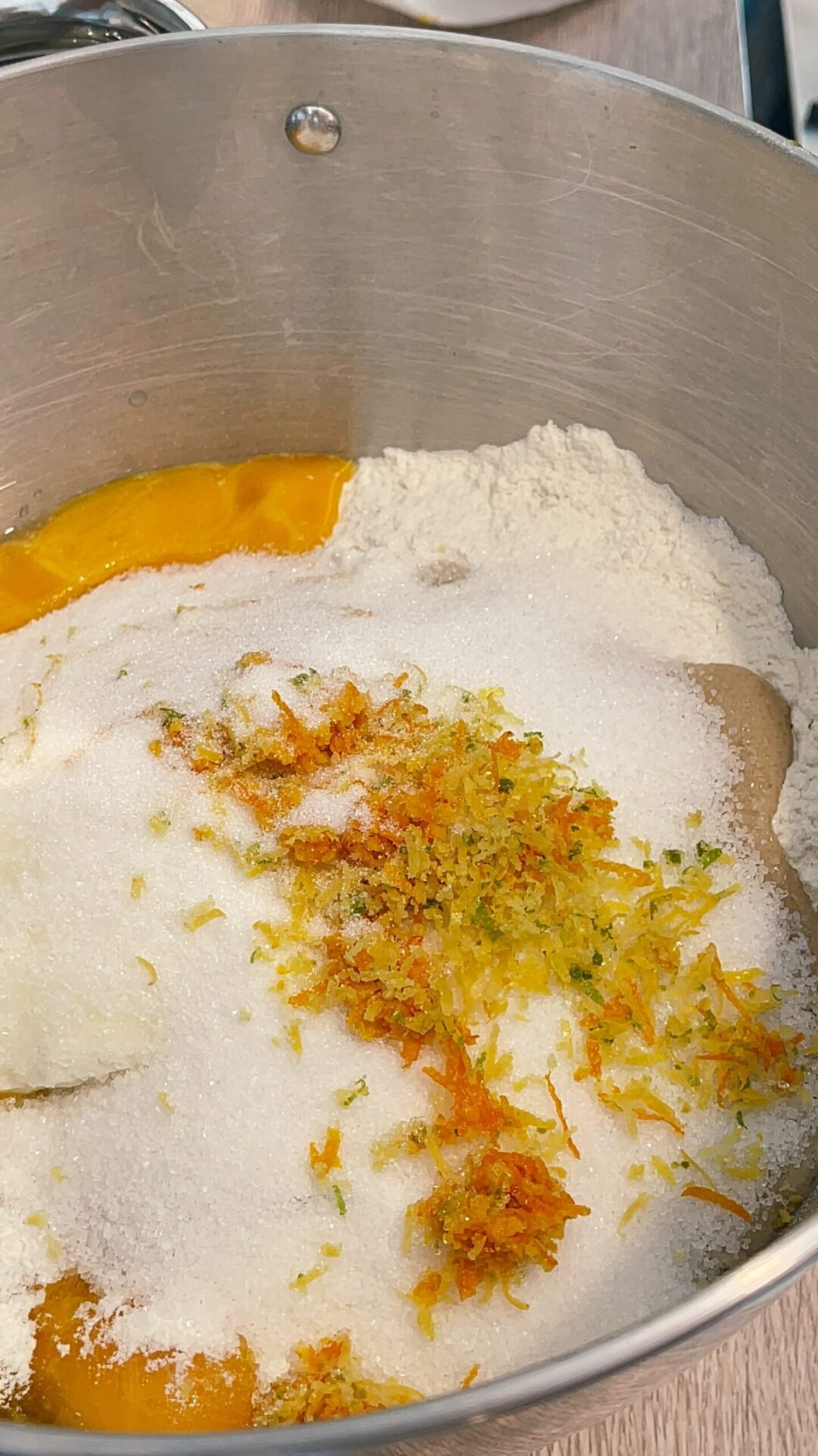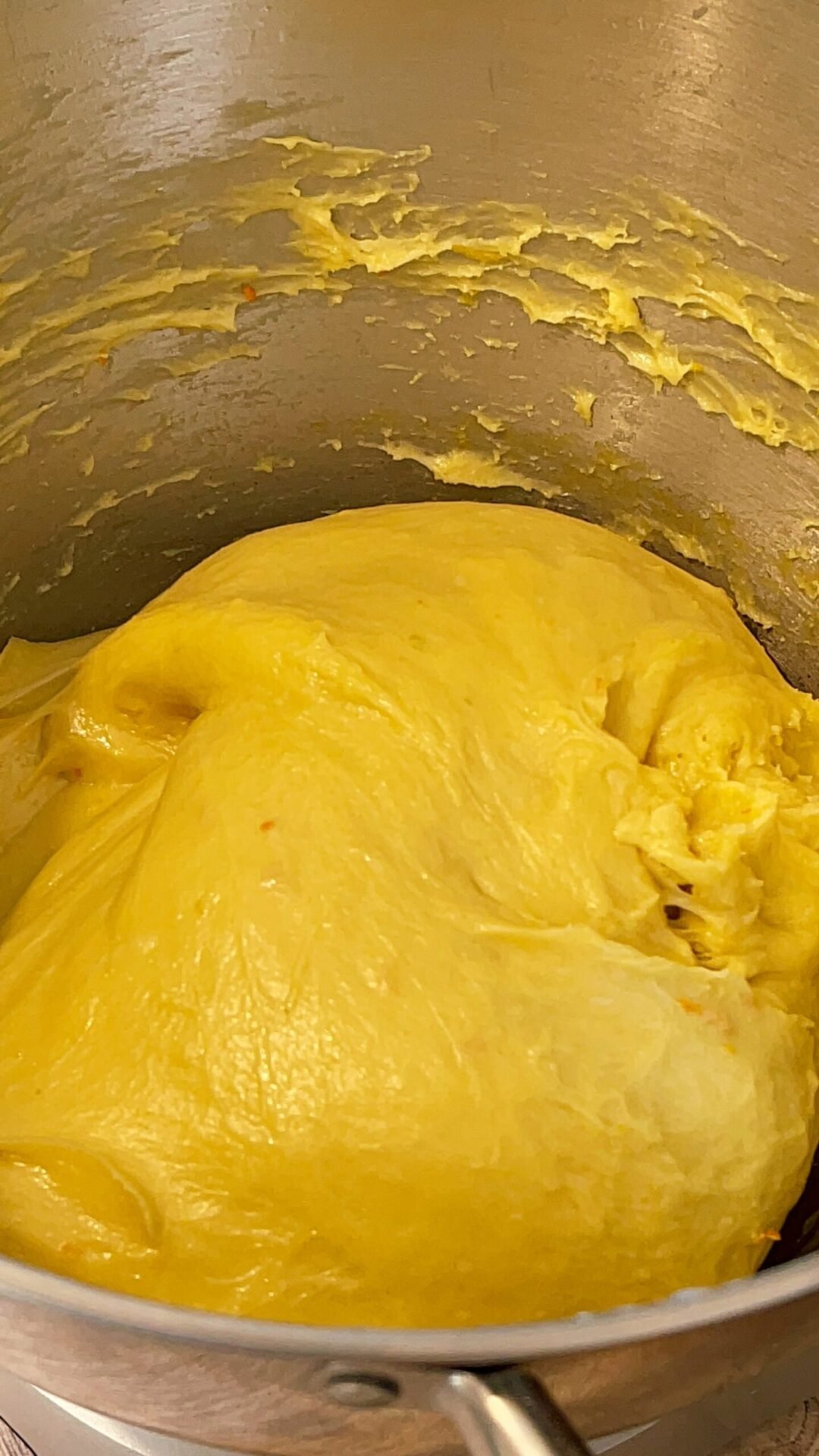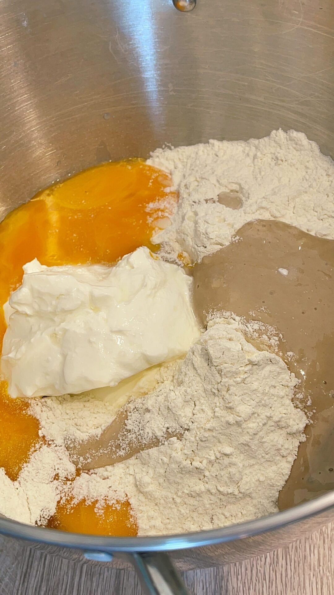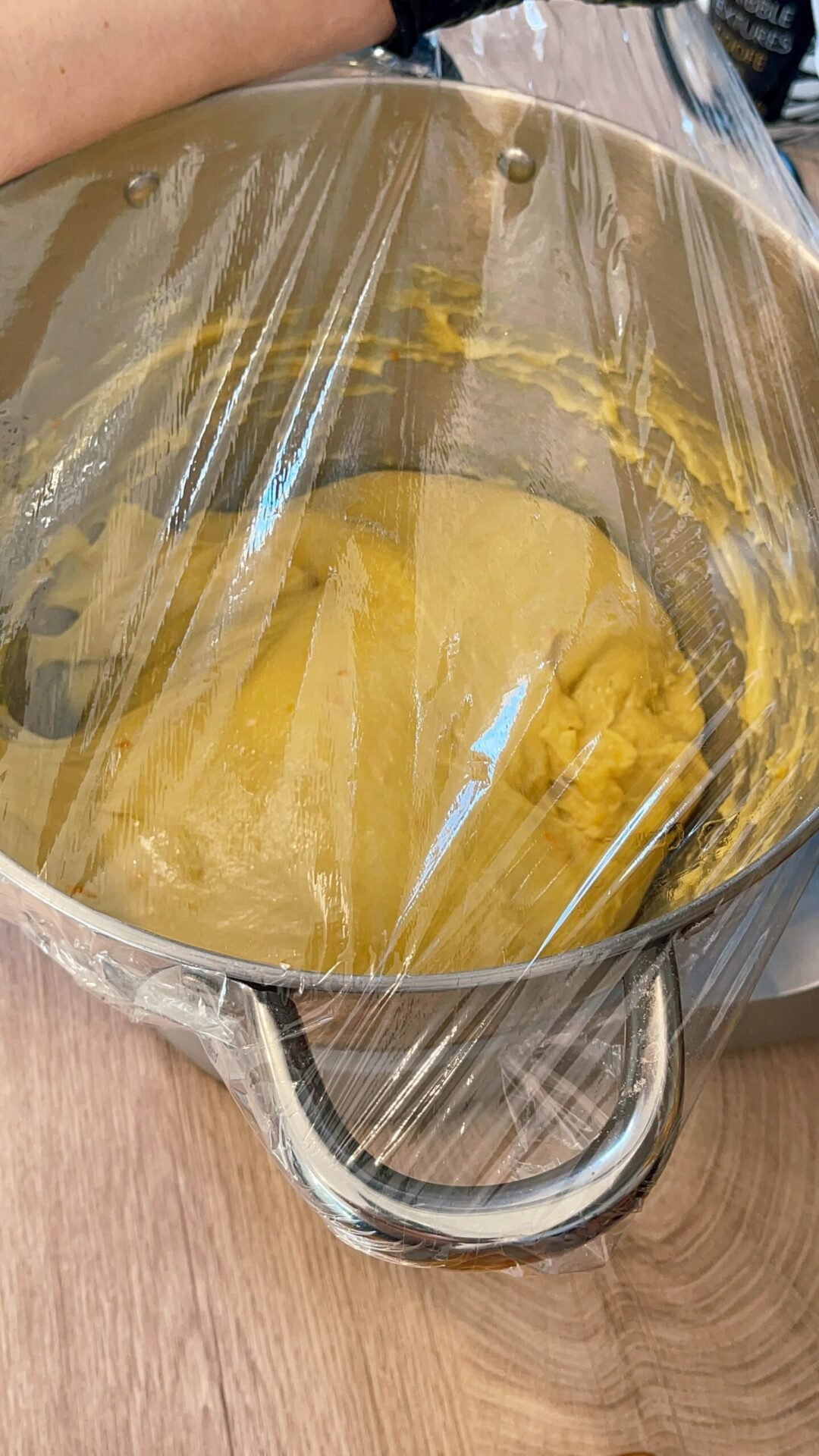 • On top of the flour and yeast, I added cream, egg yolks, sugar, vanilla, grated citrus peel and warm milk. I kneaded for 5-7 minutes, then added the soft butter. I kneaded for about 10 minutes, and at the end, I gradually incorporated the oil. I covered the bowl with foil and let the dough rise for 1 hour, even 1 hour and a half.