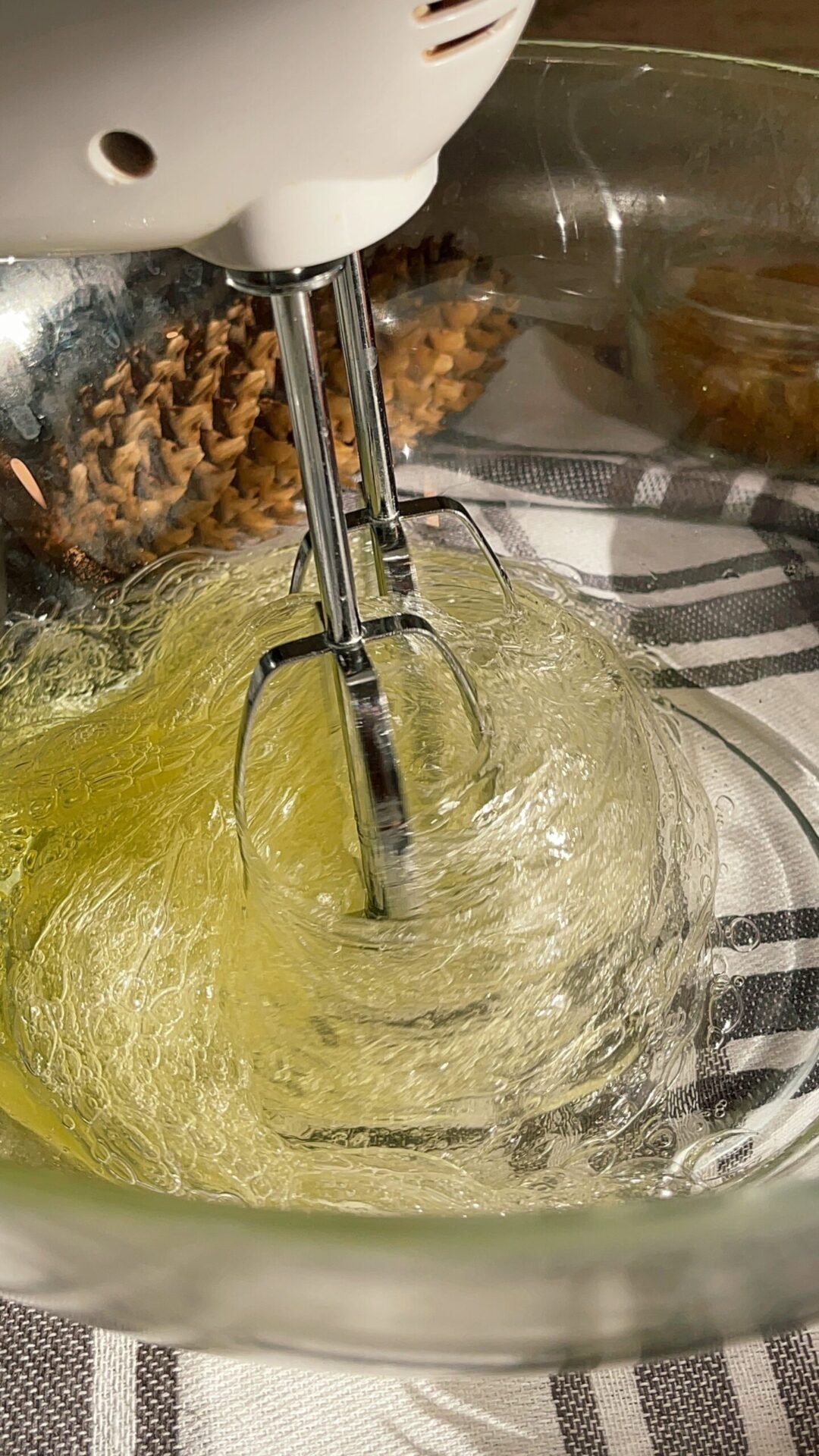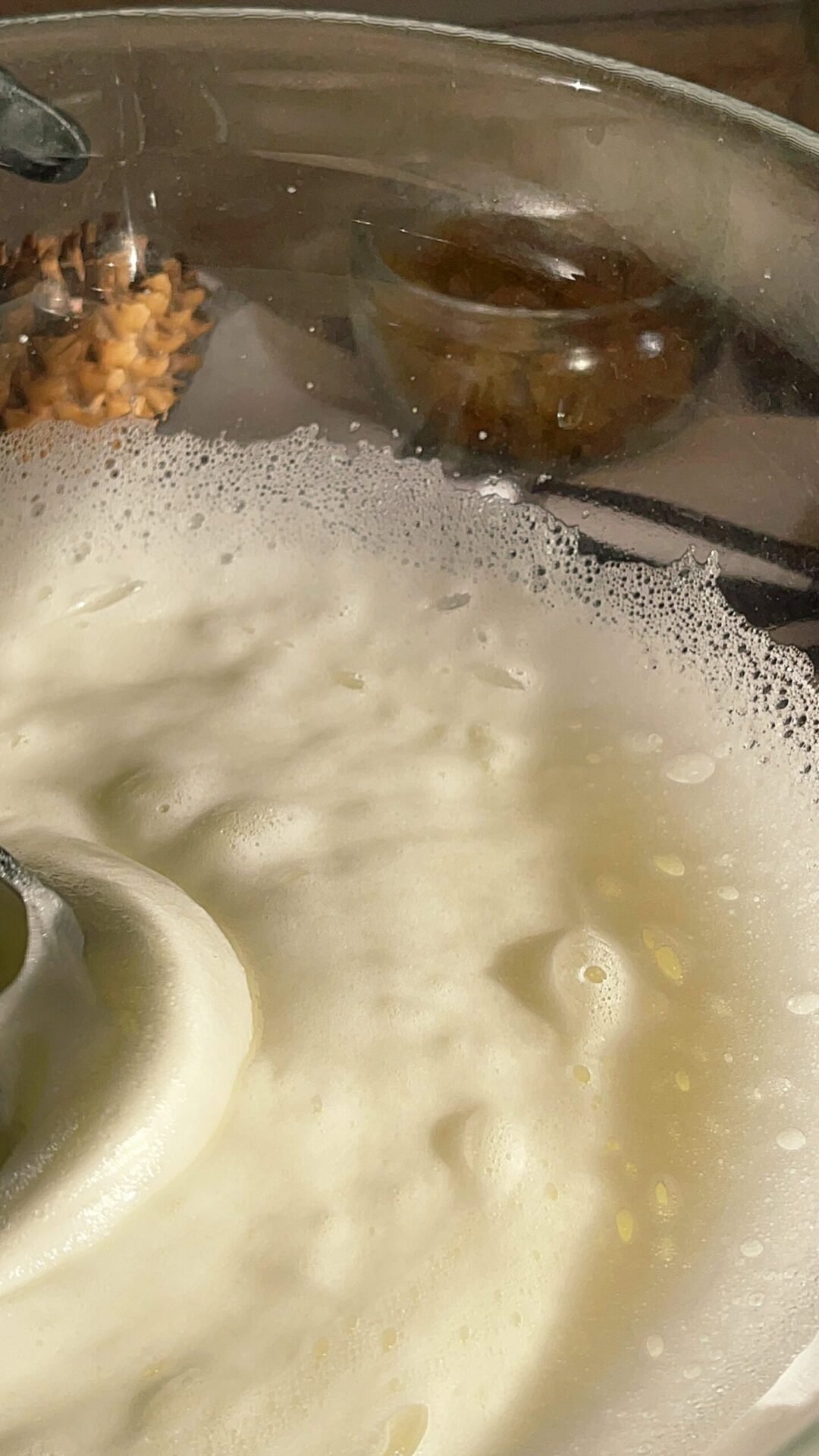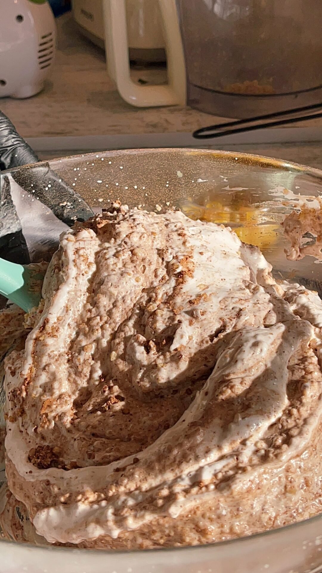 • In the last half hour, I also took care of the filling. I used 7 egg whites, added a pinch of salt and mixed them with a mixer, adding the sugar gradually, until I got a meringue. I ground the walnut in the robot, then added it over the meringue, together with the cocoa and rum essence. I added a few drops of essence and over the raisins and water as close as possible to cover them to hydrate them.