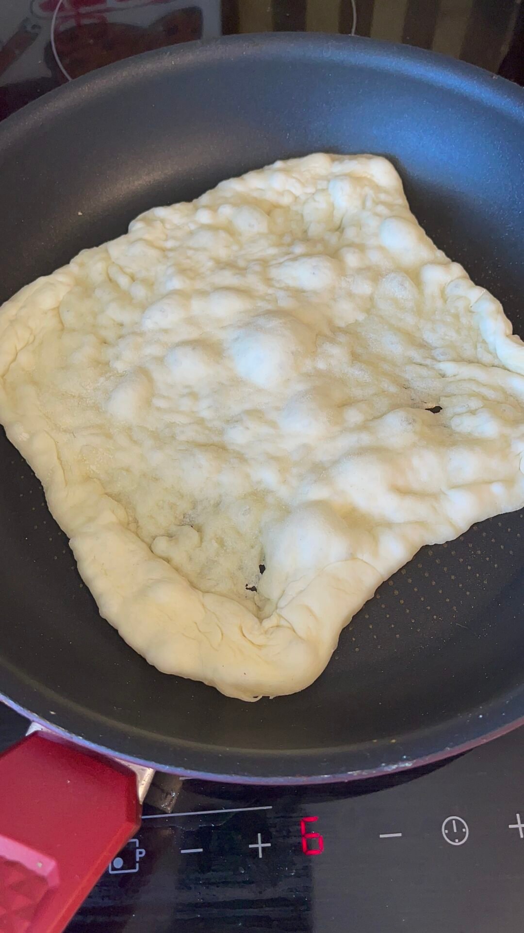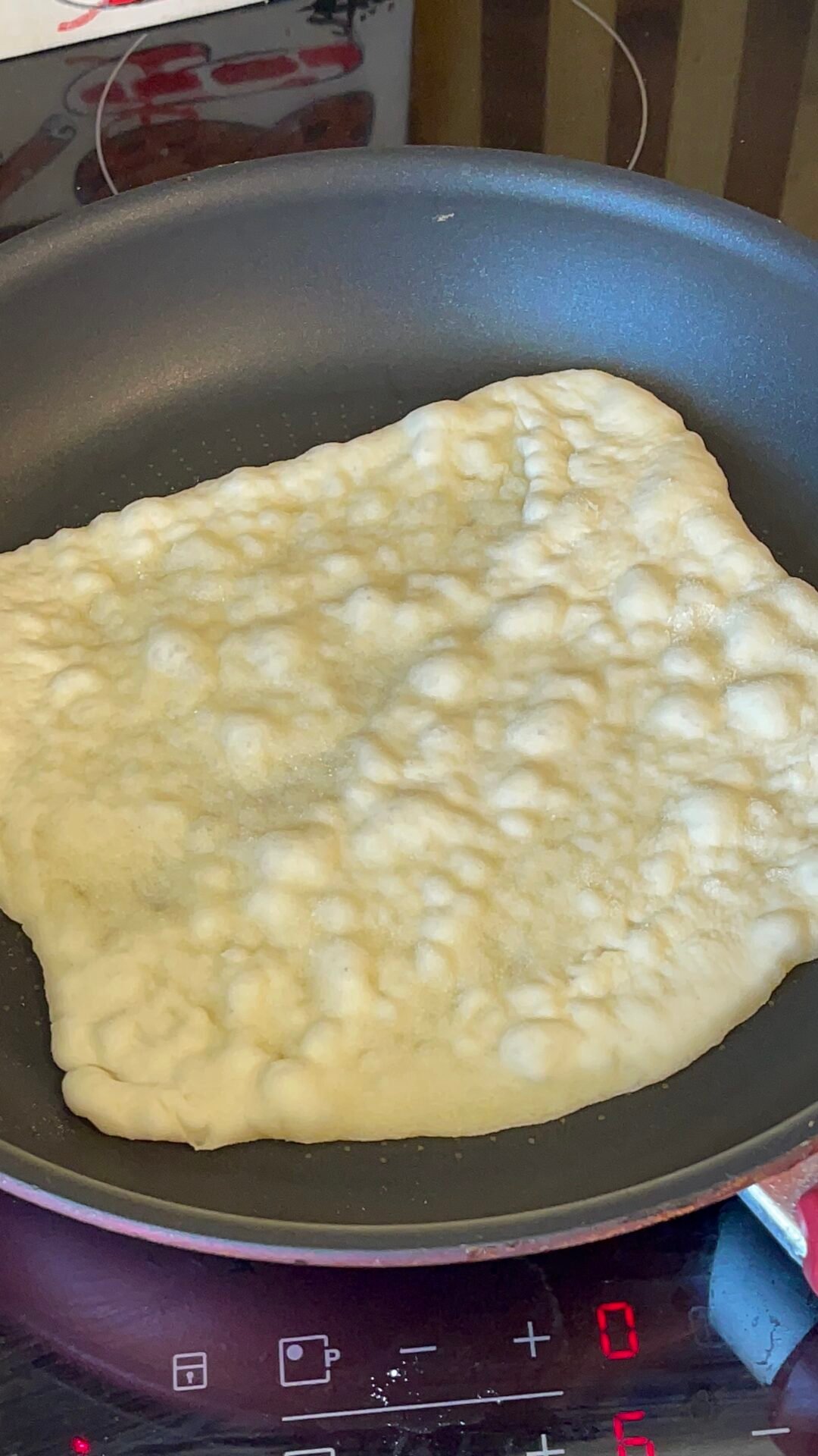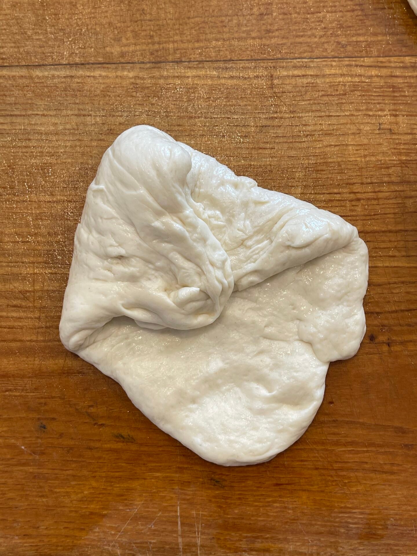 • What a beauty of dough I have here, after the last round of raising. I added flour to the work surface and rolled out the flatbread as thin as the dough allowed. I baked each flatbread on low to medium heat, using a non-stick pan in which I did not add oil.