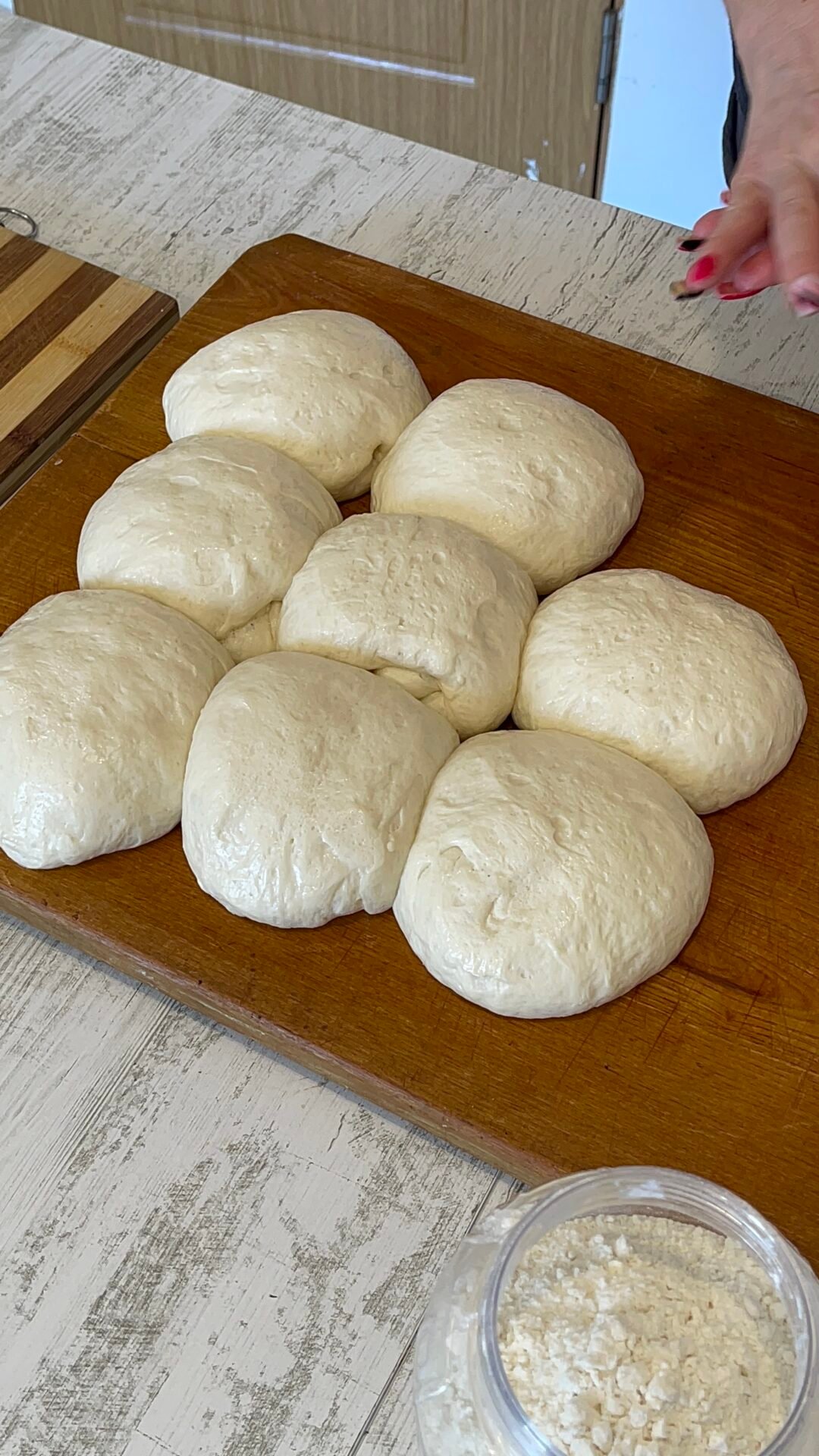 • The dough rose very nicely. I took it out of the bowl and weighed it (it is not mandatory) then I divided it into 8 equal parts. Depending on how big or small you want the glue. I took each piece and gave it a round shape, using the stretch and fold method. I let the dough rise for another 30 minutes, on the table, covered with foil to prevent it from drying out.