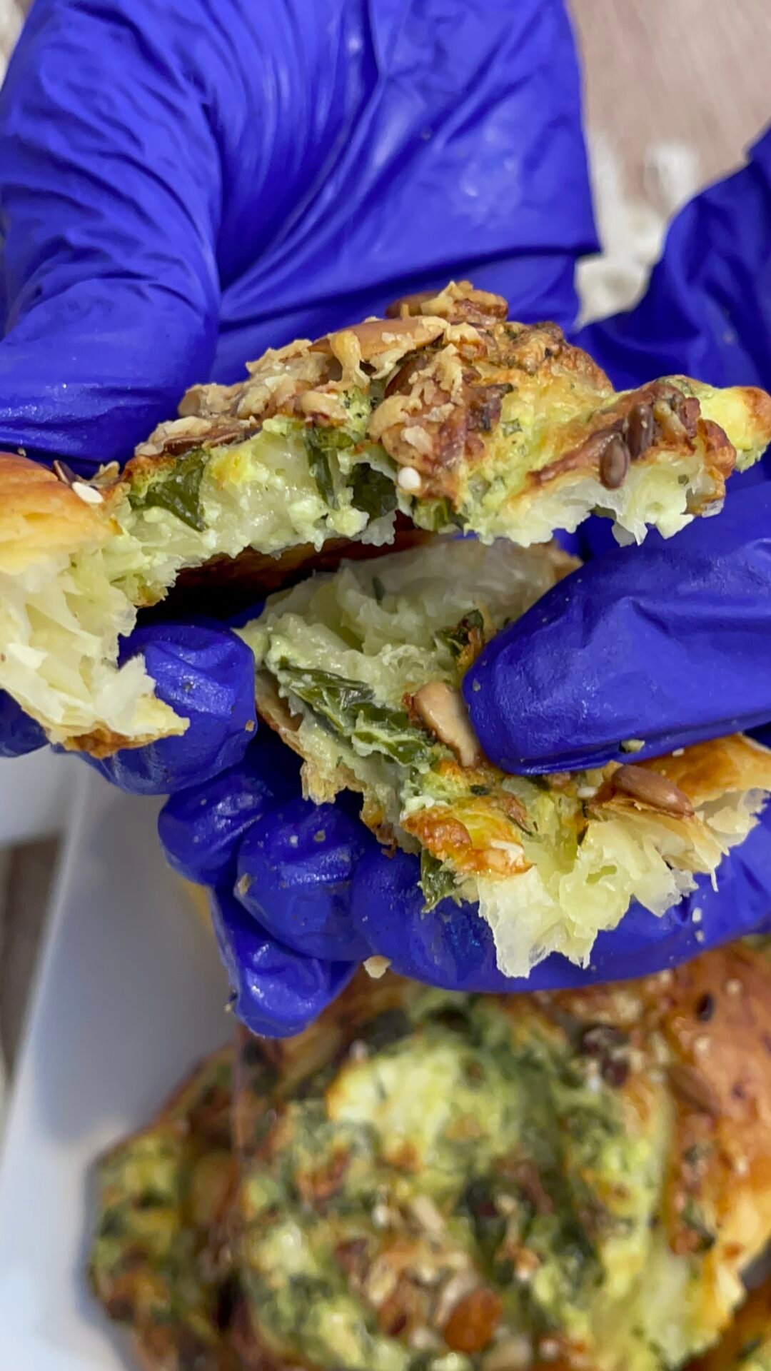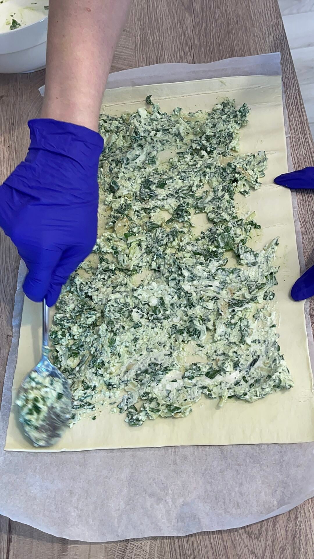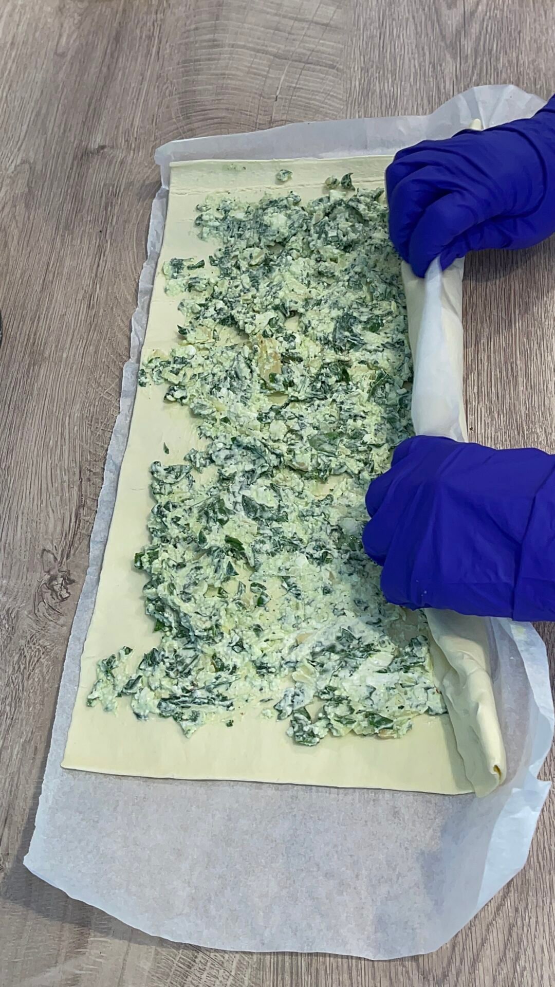- With the help of a spoon, add the mixture of cheeses and spinach and spread it over the entire surface of the dough. We start to roll the dough, the opposite of how it was packed to get a huge and long roll and not a big log of filled dough, because it would look unaesthetic and useless if we don’t want to get gigantic rolls that are hard to eat. To roll more easily, we use the paper in which the dough was wrapped, that’s why we keep it from the very beginning, and as a small tip, we make less mess, in conclusion we have less to clean.