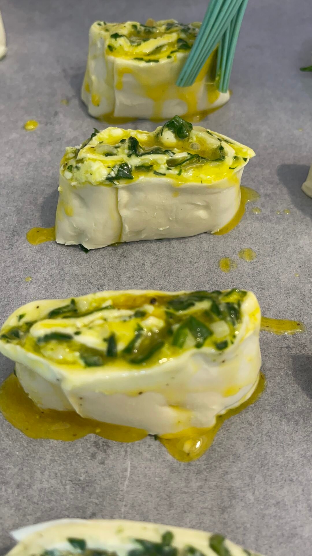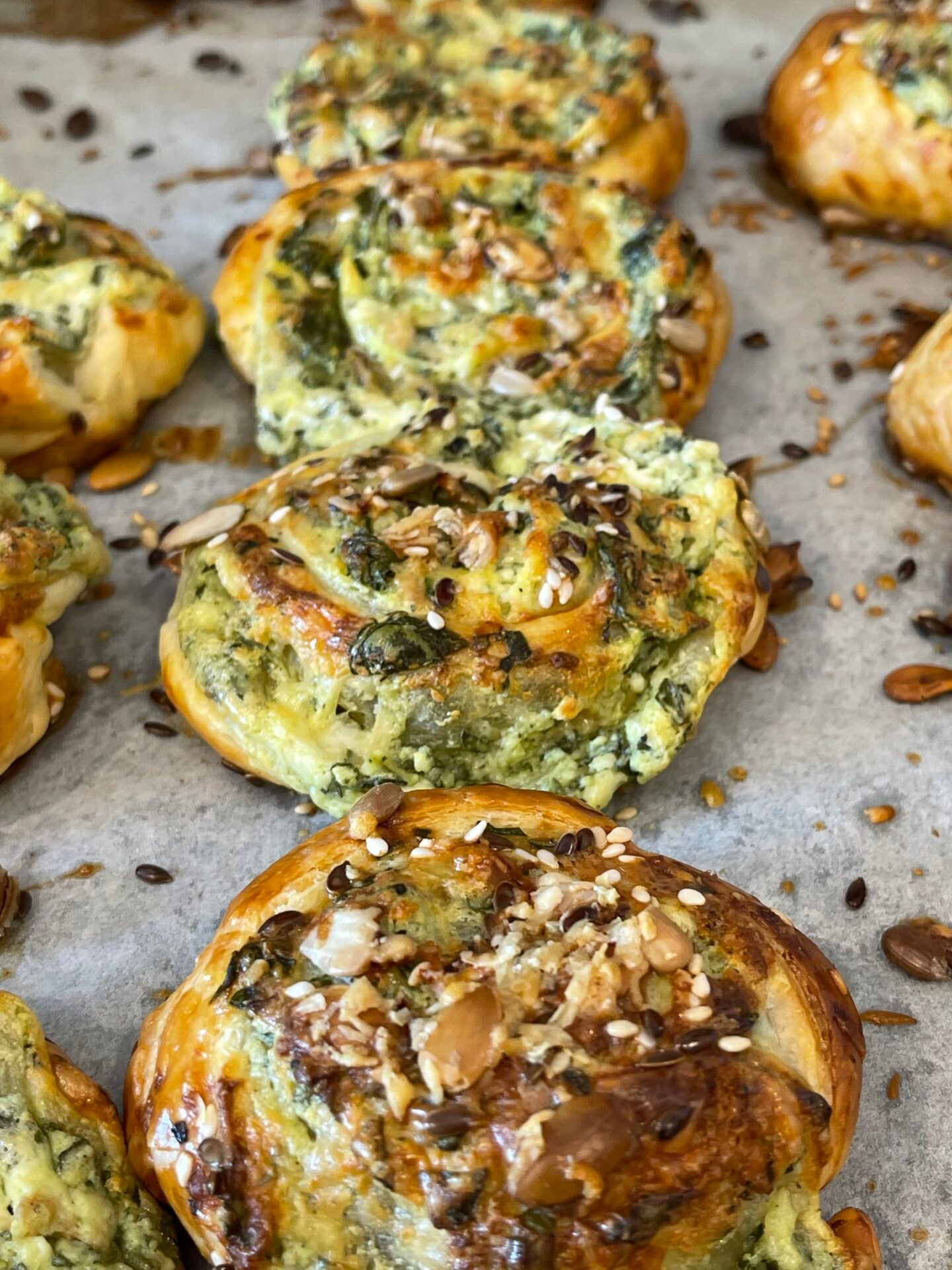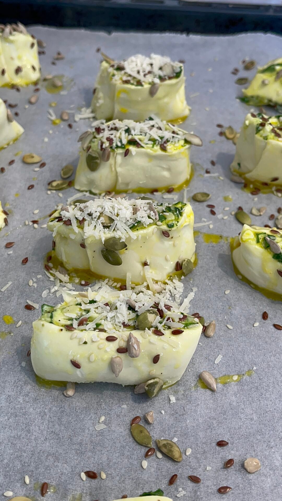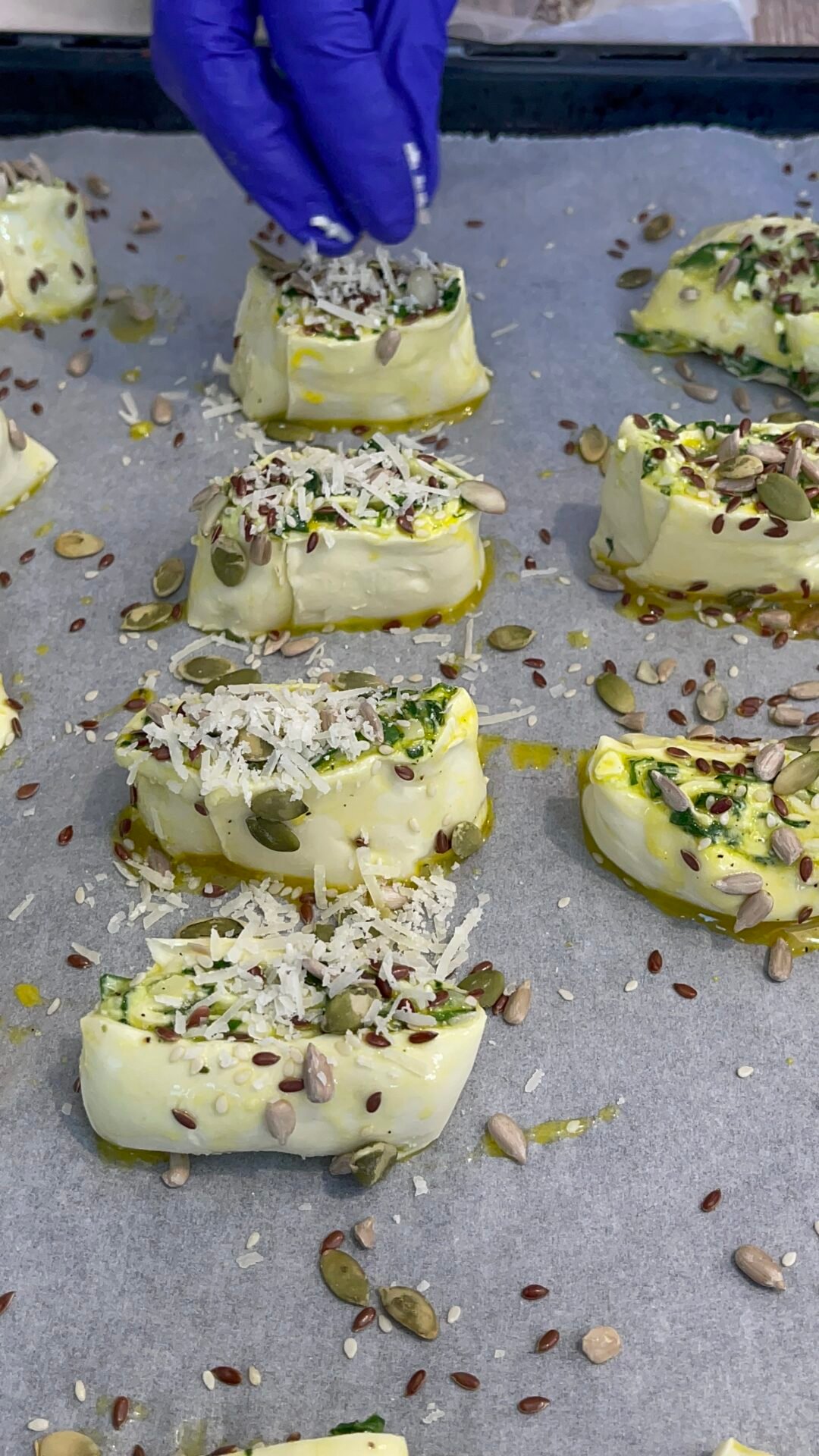 - With the help of a well-sharpened knife, we begin to cut the dough into 2-3 cm thick pieces. We clean the knife with a kitchen paper towel after using it 2 times, to avoid sticking the dough to the blade of the knife. In an oven tray lined with baking paper, place the spinach and cheese rolls with the filling on top. So on top we will see cute spirals of dough filled with cheeses and greens.