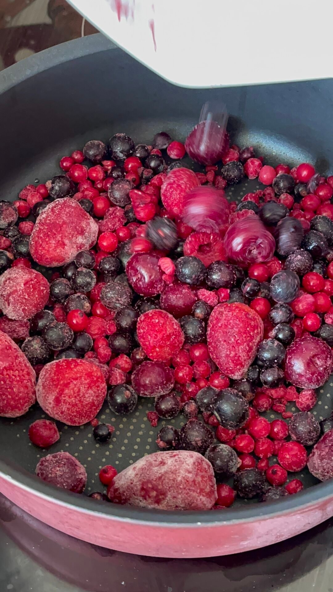 - While the dough is baking, prepare the cream, the berry jelly and the syrup in turn. All 3 require cooling time so you can also prepare them the day before if you want. Let’s start with the fruit jelly. We put the frozen berries in a saucepan, add sugar and boil on low heat until the liquid evaporates. Add the lemon juice and boil for another 5 minutes, then turn off the heat and leave to cool. You can use the blender if you want a creamier jelly, I preferred to leave it like this with almost whole pieces of fruit.