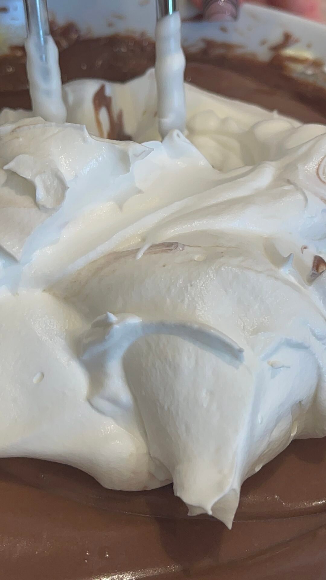 - In a bowl, beat the cream with the help of a mixer and leave it aside. In the well-chilled chocolate cream, add the soft butter at room temperature and mix with the mixer until all the butter is incorporated. Then we add a little bit of the whipped cream and mix until we get our delicious chocolate cream with whipped cream. Be very careful that the chocolate cream is very cold when you add the whipped cream, otherwise you will spoil all the cream.