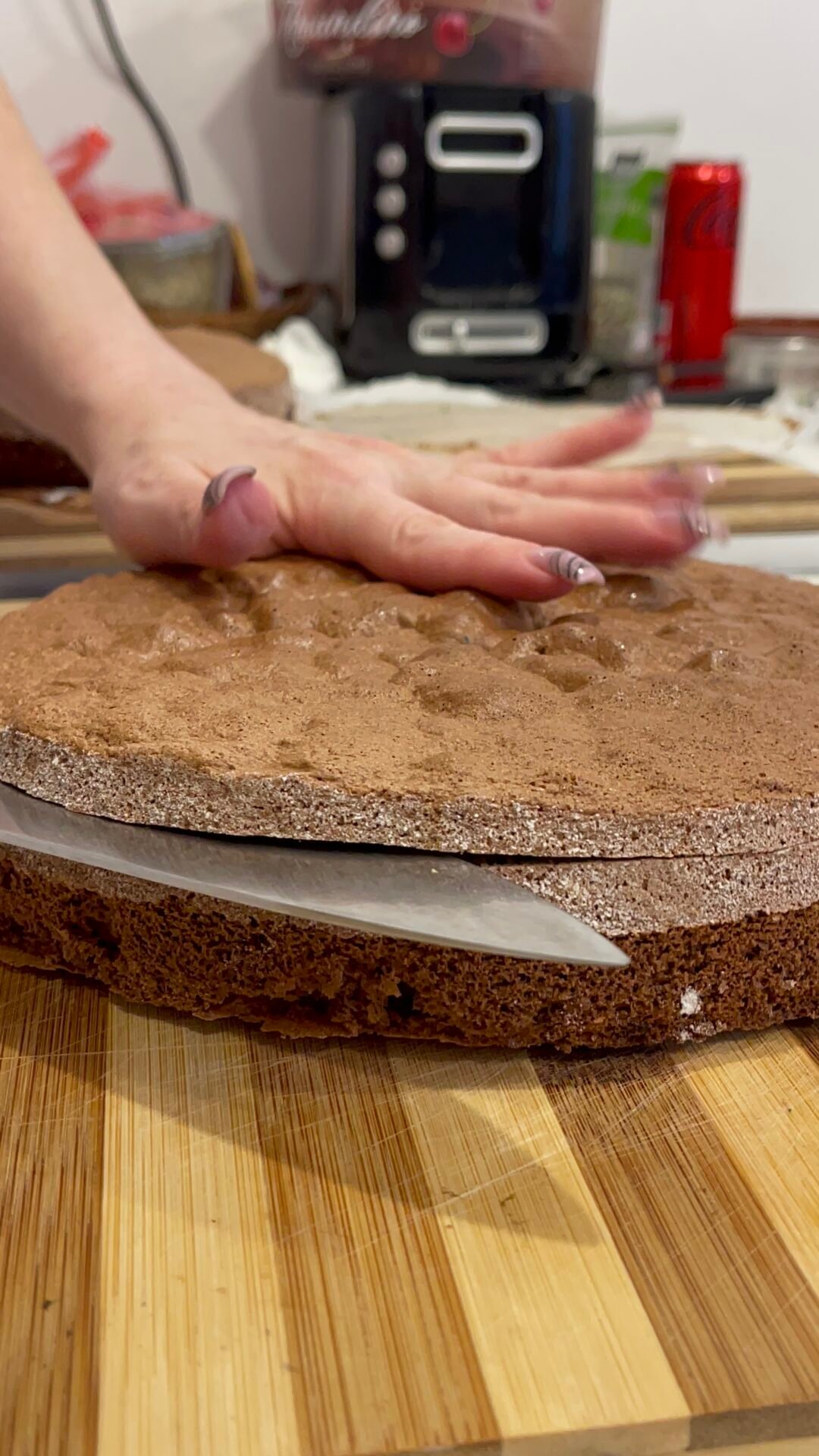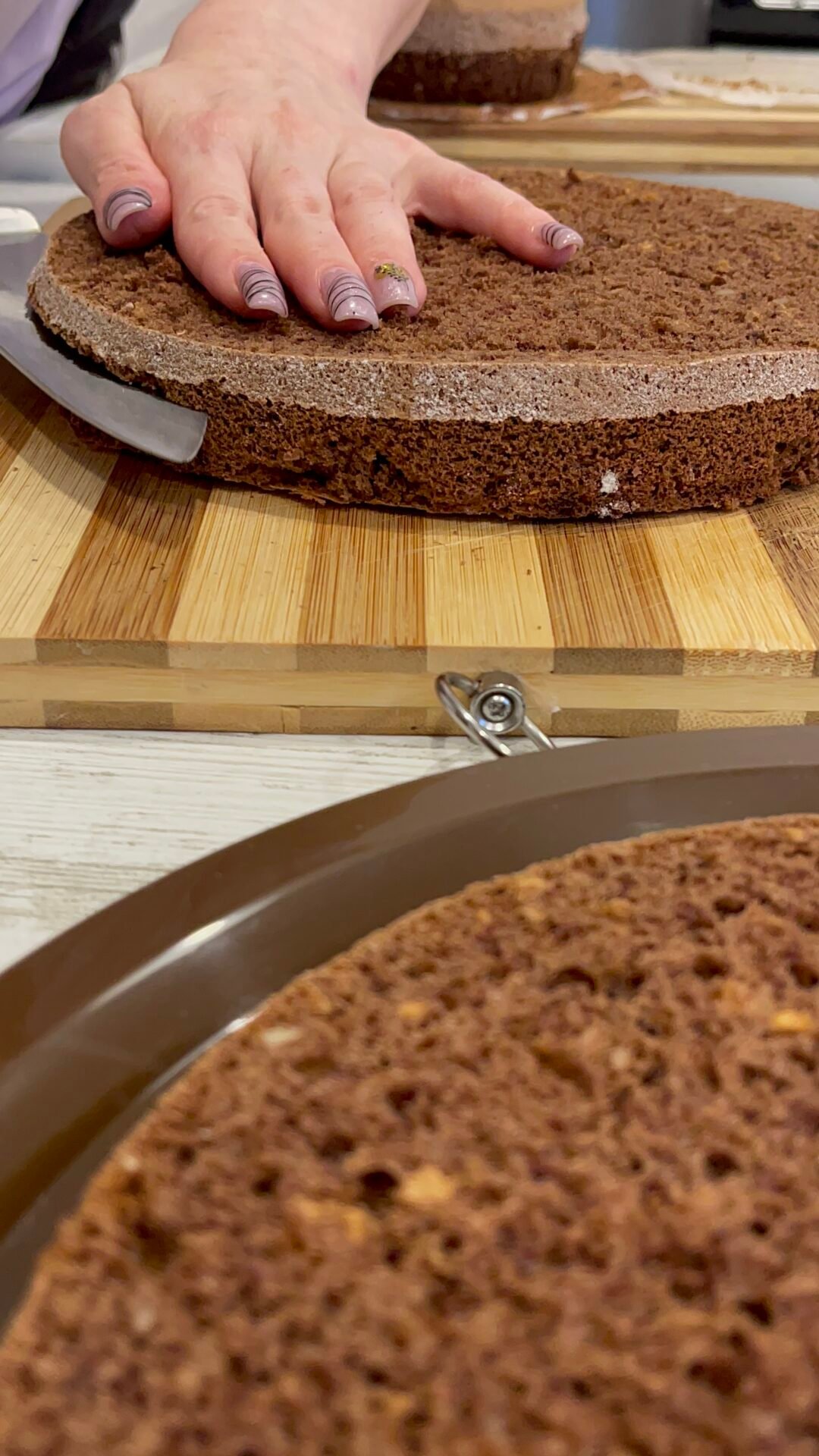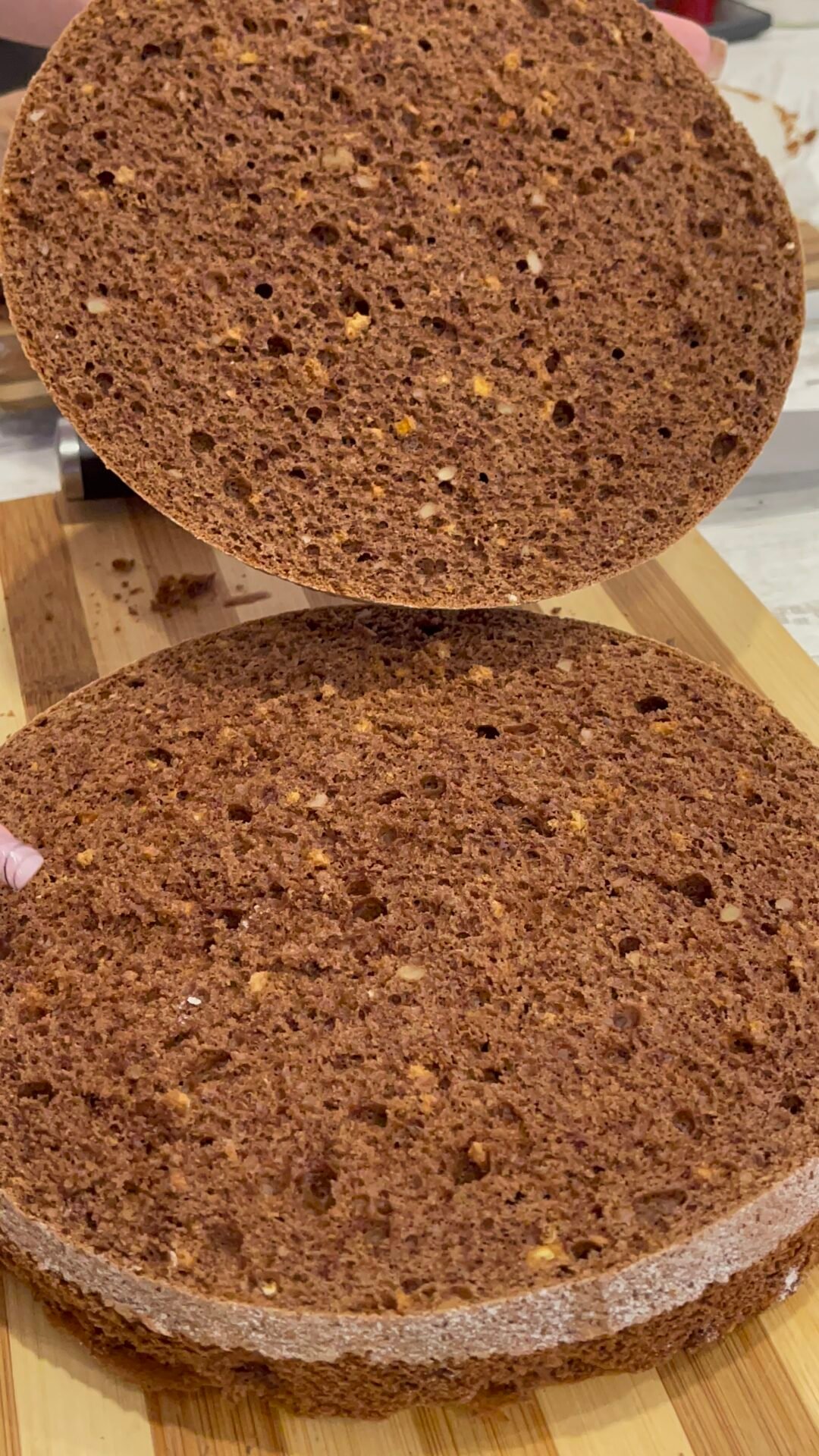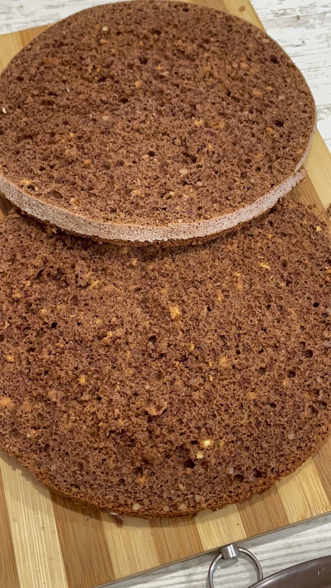 - Great, now that everything is ready, all we have to do is assemble the cake with chocolate and berries. We start by cutting the top into 3 approximately equal parts. We place as with any cake, first the top part, that is, this will be the base of the cake, and the bottom part will come on top, being the part with the straightest surface and it will be easier to decorate, but the cake will also have a nicer appearance.