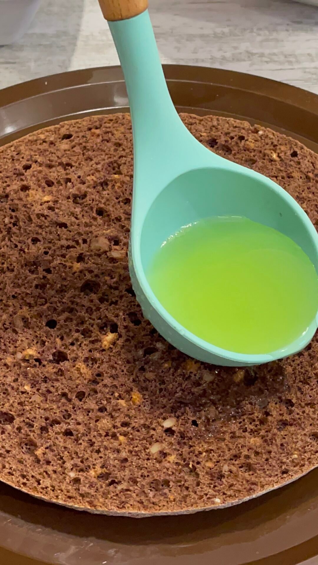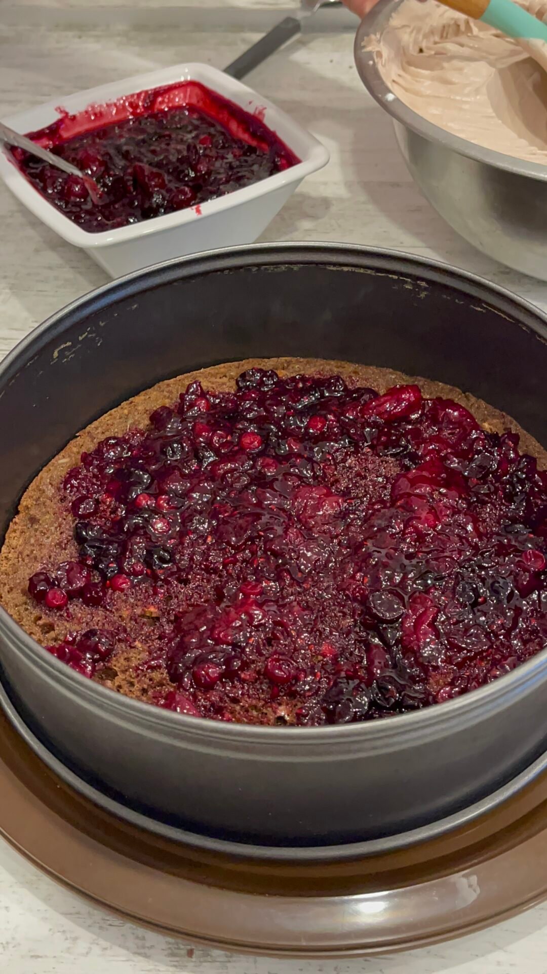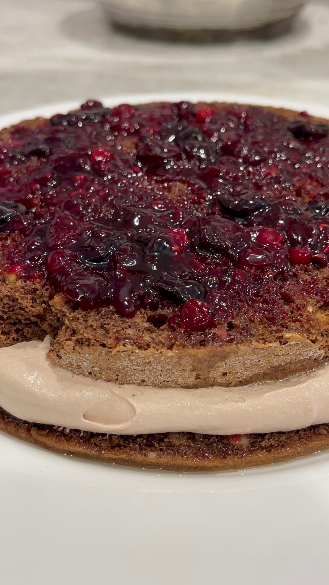 - Look how beautiful the cake is inside! Fluffy and full of nuts. I used a small ladle to pour the syrup because I knew exactly how much to put, but it’s best to put with a spoon gradually, about 8-10 spoons of syrup. We add 2-3 spoonfuls of berries in the middle and gently stretch towards the edges without pressing too hard with the spoon.