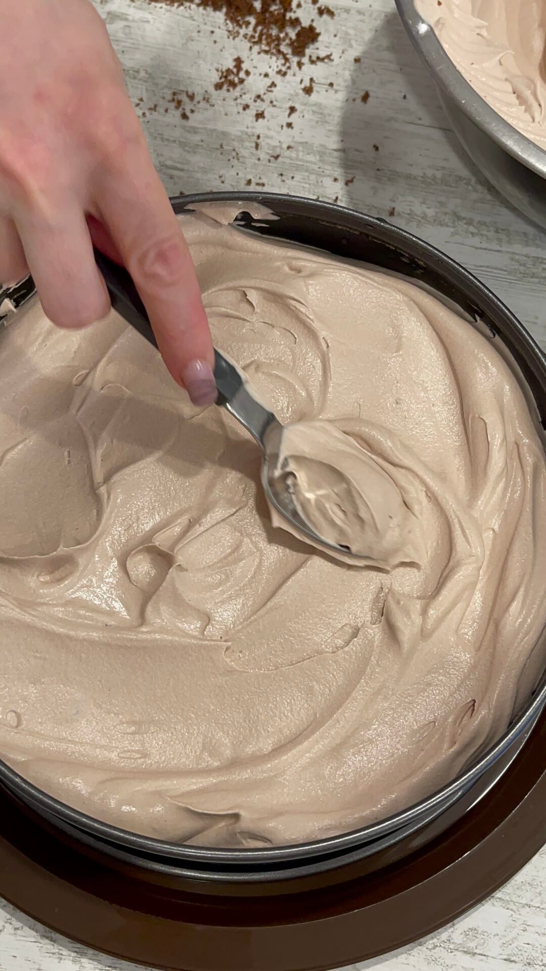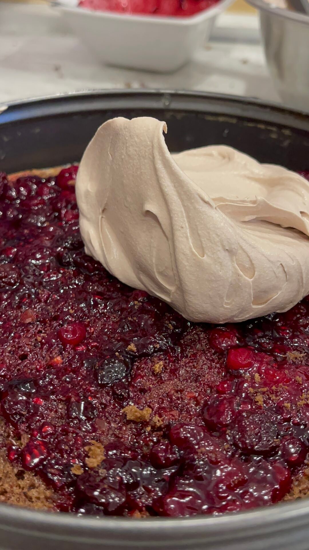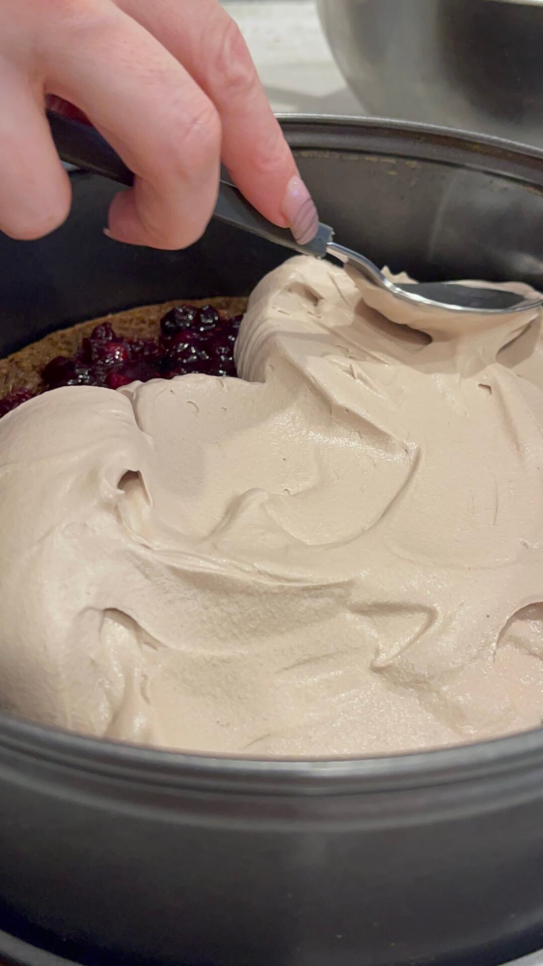 - On top of the berries, add about a quarter of the chocolate cream with whipped cream, spread well but gently over the entire surface. If it is easier for you, divide the cream from the beginning into 3 parts, keeping in mind that you will need a little cream for the decoration as well.