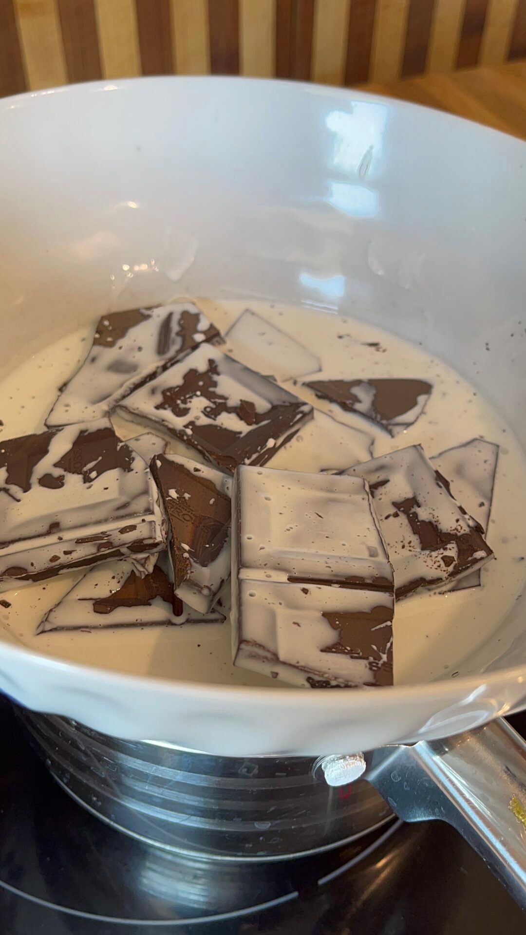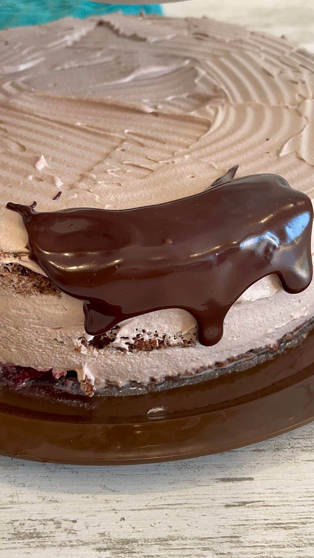 - We use a knife with a wide blade or a spatula to nicely smooth the edge of the cake. I added a little cream on top and gave it a slightly wavy appearance. Separately, I put 150 g of dark chocolate and 200 ml of liquid cream in a bowl. I kept everything in the bain marie until the chocolate melted and a glaze resulted.