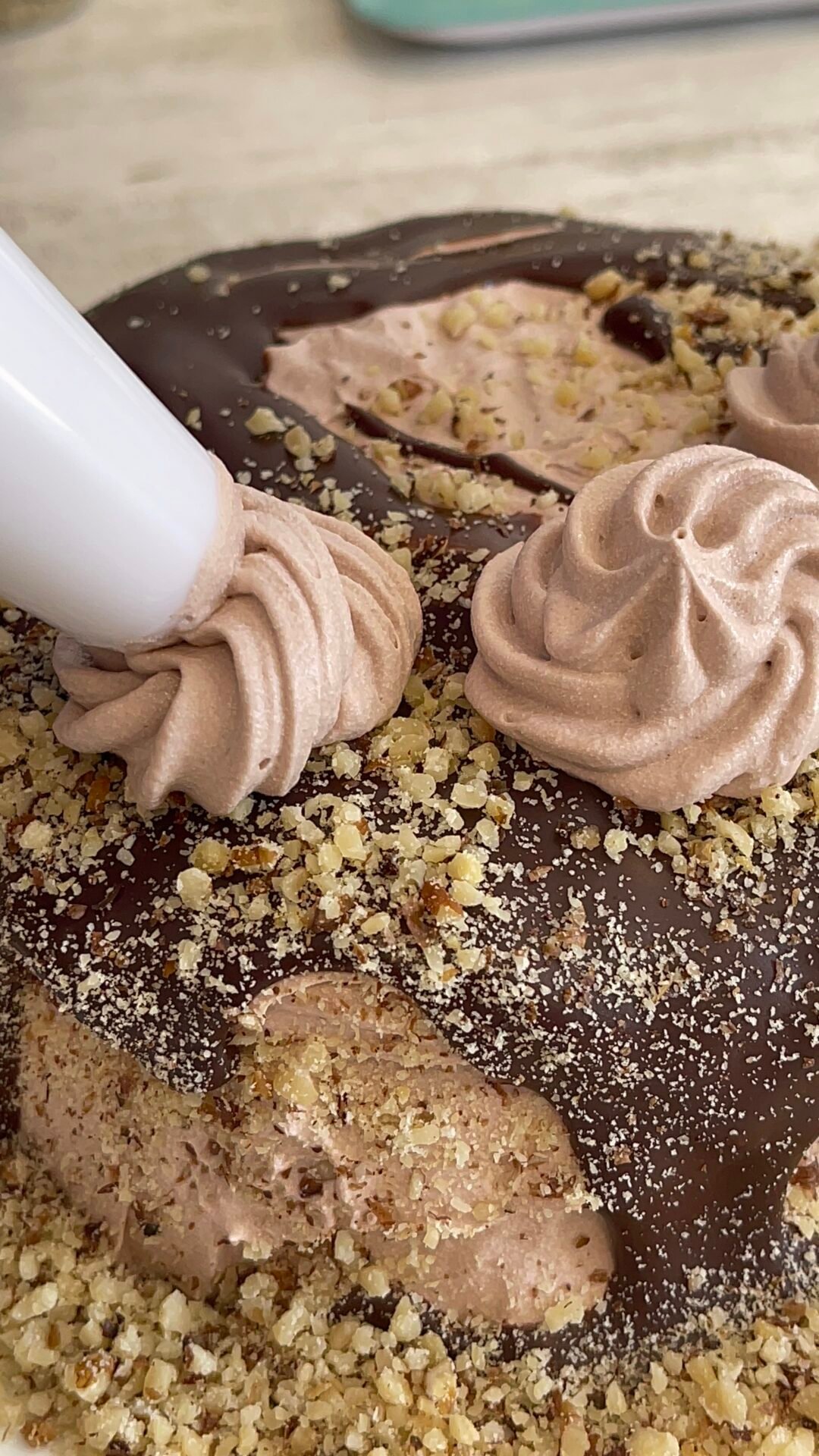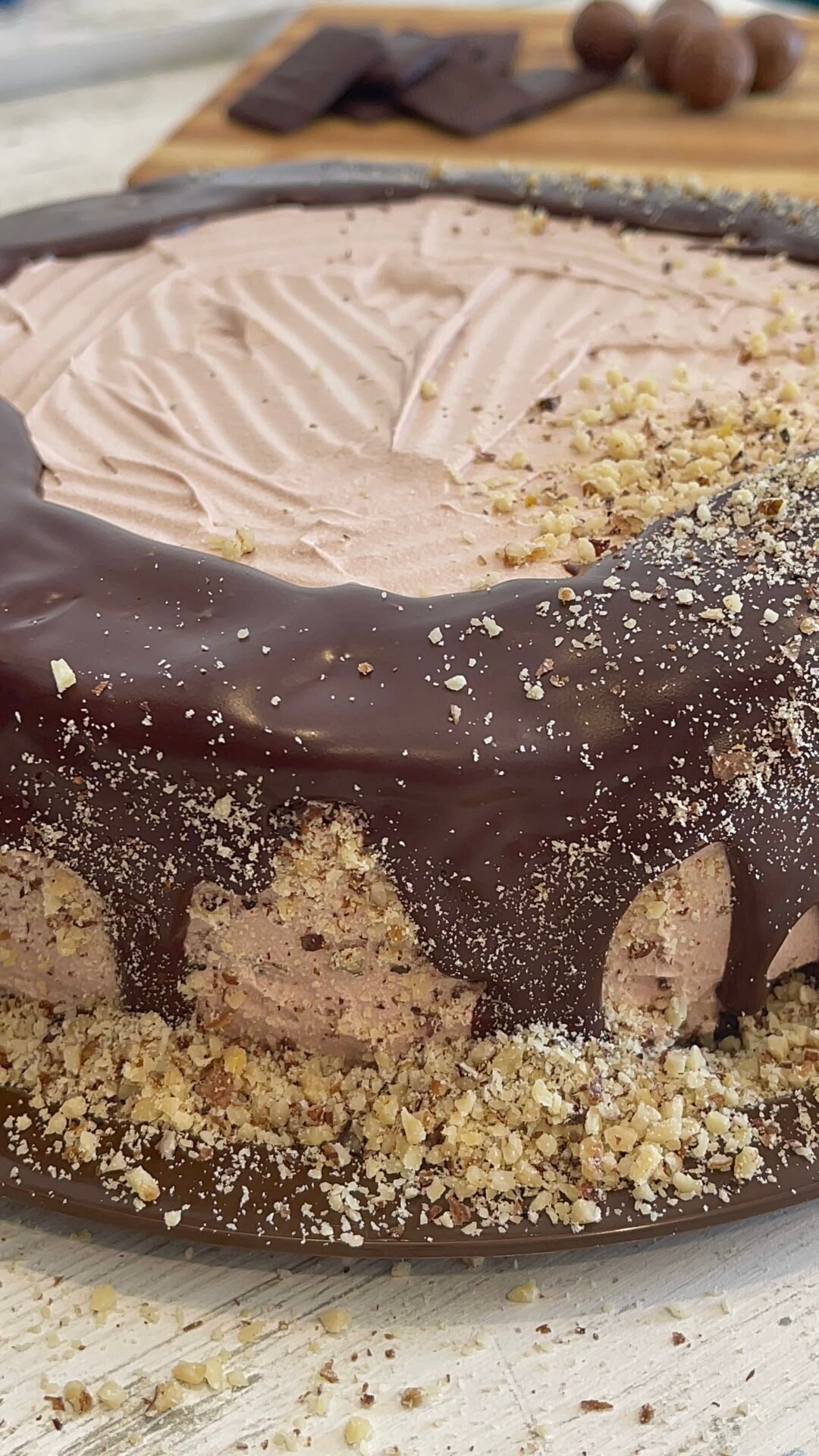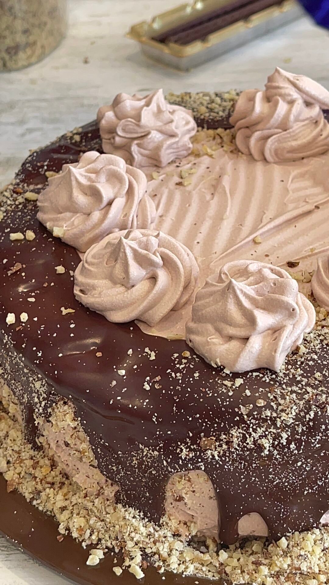 - I poured the warm glaze in abundance, on the edges of the cake. Then very quickly, so that the chocolate does not harden, I decorated the sides with ground walnuts. This will stick to the chocolate glaze, the important thing is to have everything at hand and to move quickly.