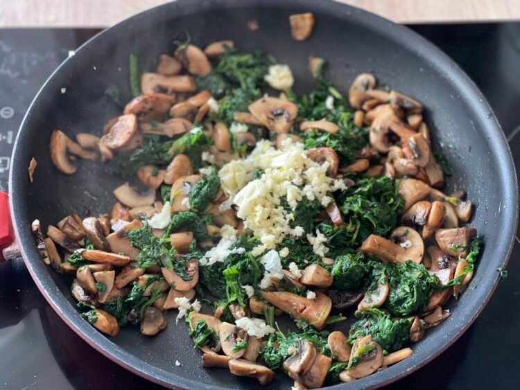 Finely chop the mushrooms and sauté them in a tablespoon of oil, uncovered, until all the water has evaporated, so the filling isn’t watery. Add the minced garlic, salt, and pepper, then the well-drained spinach, and cook everything for another 2–3 minutes. Remove the mixture from the heat and let it cool slightly.