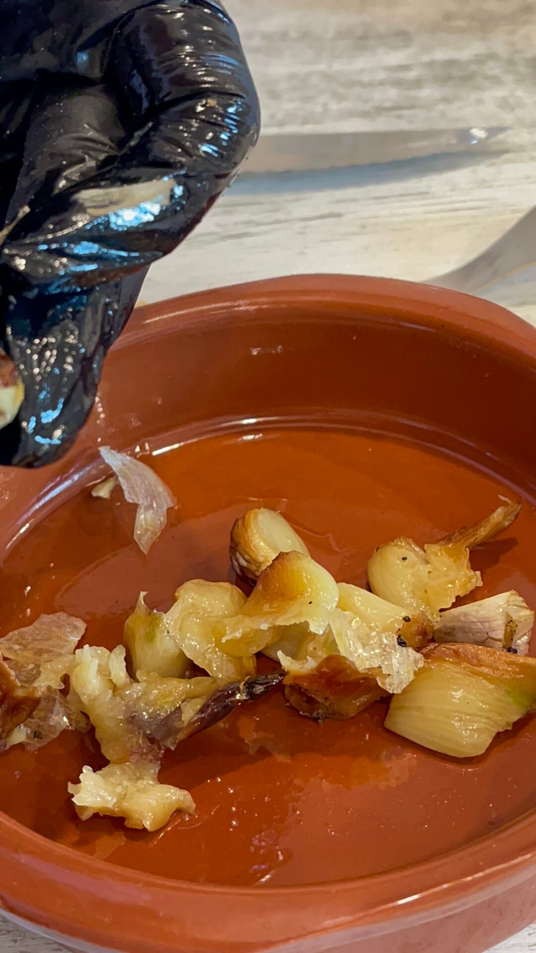 - I heated the oven to 200 degrees. I cut a little of the part with the “whiskered” roots of the garlic, sprinkled olive oil and seasoned with salt and pepper. I wrapped the garlic seasoned in this way in tin foil and baked it for about 30 minutes.