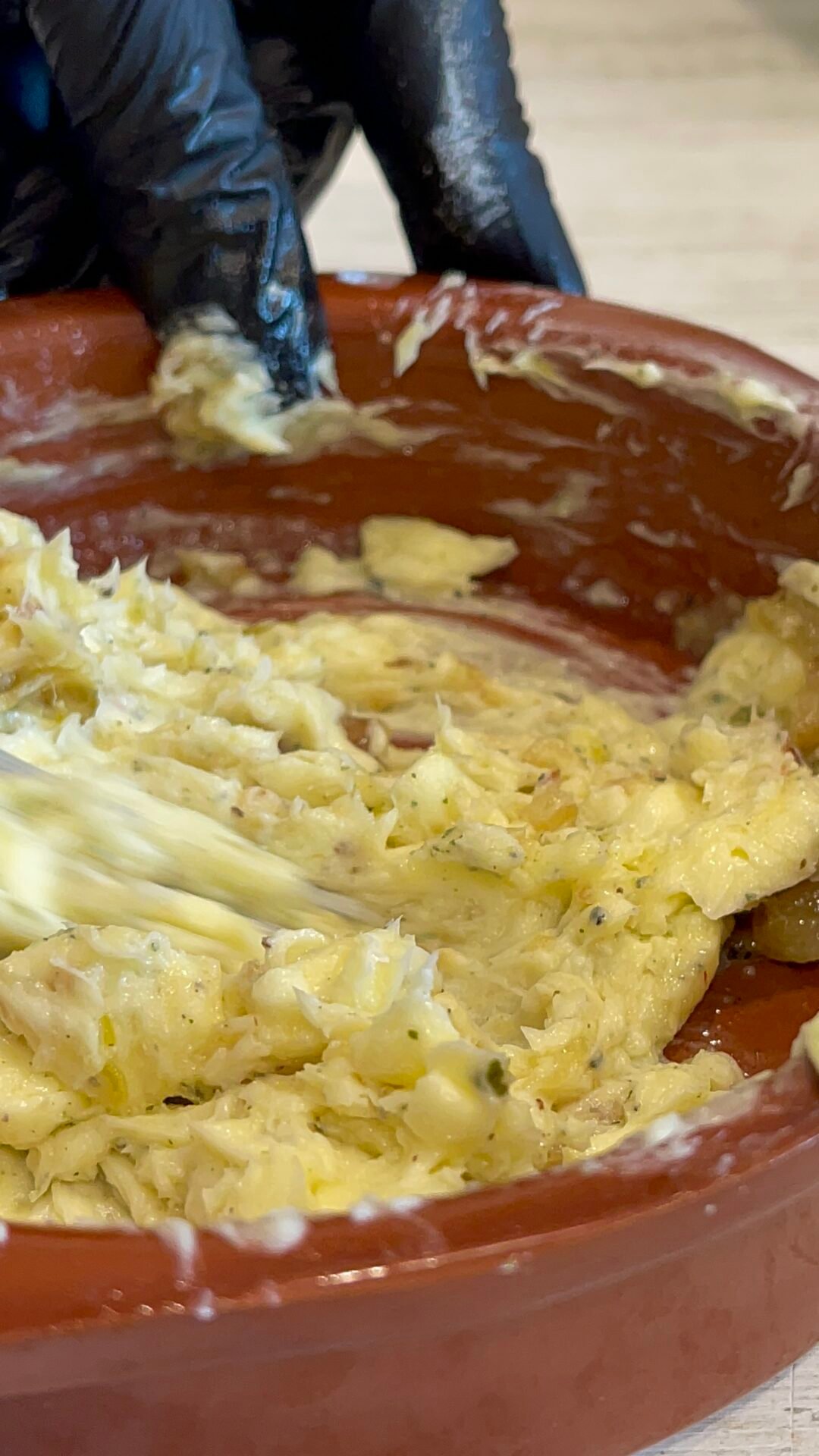 - The garlic is baked and I let it cool down for 10 minutes. I unpacked it and squeezed out the baked cloves of garlic. They come out easily, pressing lightly with your fingers. I crushed it with a fork and mixed it with soft butter, salt, pepper and herbs de Provence. This will be the filling for my pull apart bread.