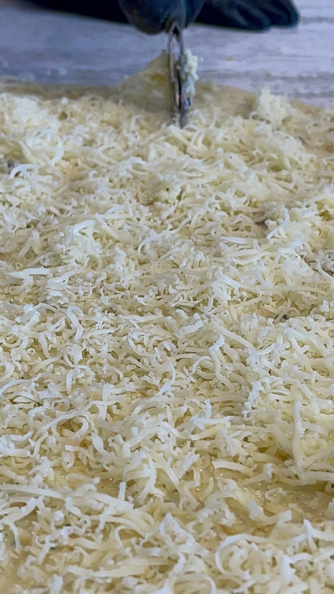 - After the dough has risen enough (doubled in volume), I spread it on the lightly floured table, with the help of a rolling pin. I spread the butter cream and baked garlic over the entire surface, then finely grated the smoked cheese on top.