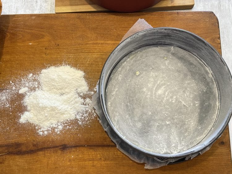 - Revenim la aluatul nostru minunat, scoatem doar jumatate din frigider, restul il lasam sa se raceasca. Amintiți-vă că aluatul trebuie păstrat cât mai rece și manipulat doar cât este necesar. Am ales sa folosesc o tava cu fund detasabil, in care am asezat hartie de copt, apoi am uns-o cu unt si am tapetat-o cu 1 lingura de faina. Asezati aluatul in tava, presarati cat mai multa faina intre degete si cu palma intindeti aluatul in tava, ridicand putin marginile. Înțepăm aluatul din loc în loc cu o furculiță, în acest fel aluatul nu va rămâne umed după coacere.