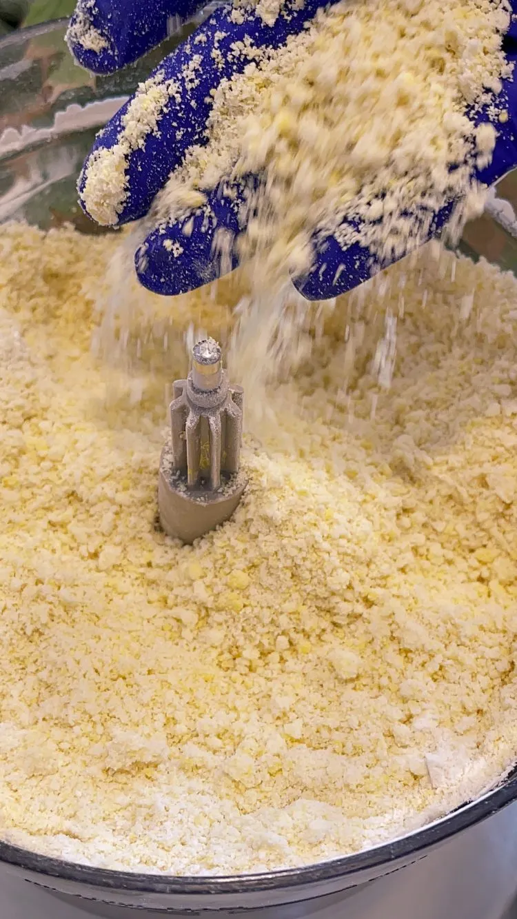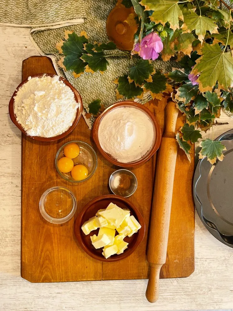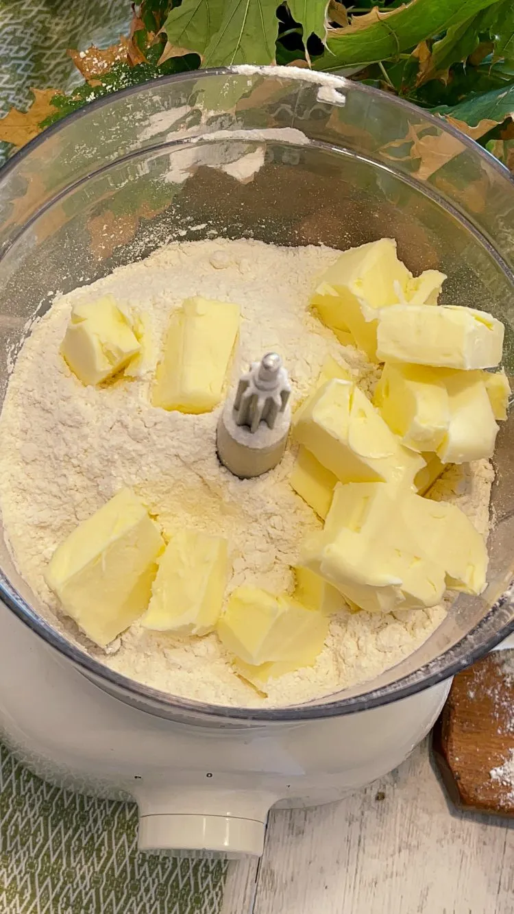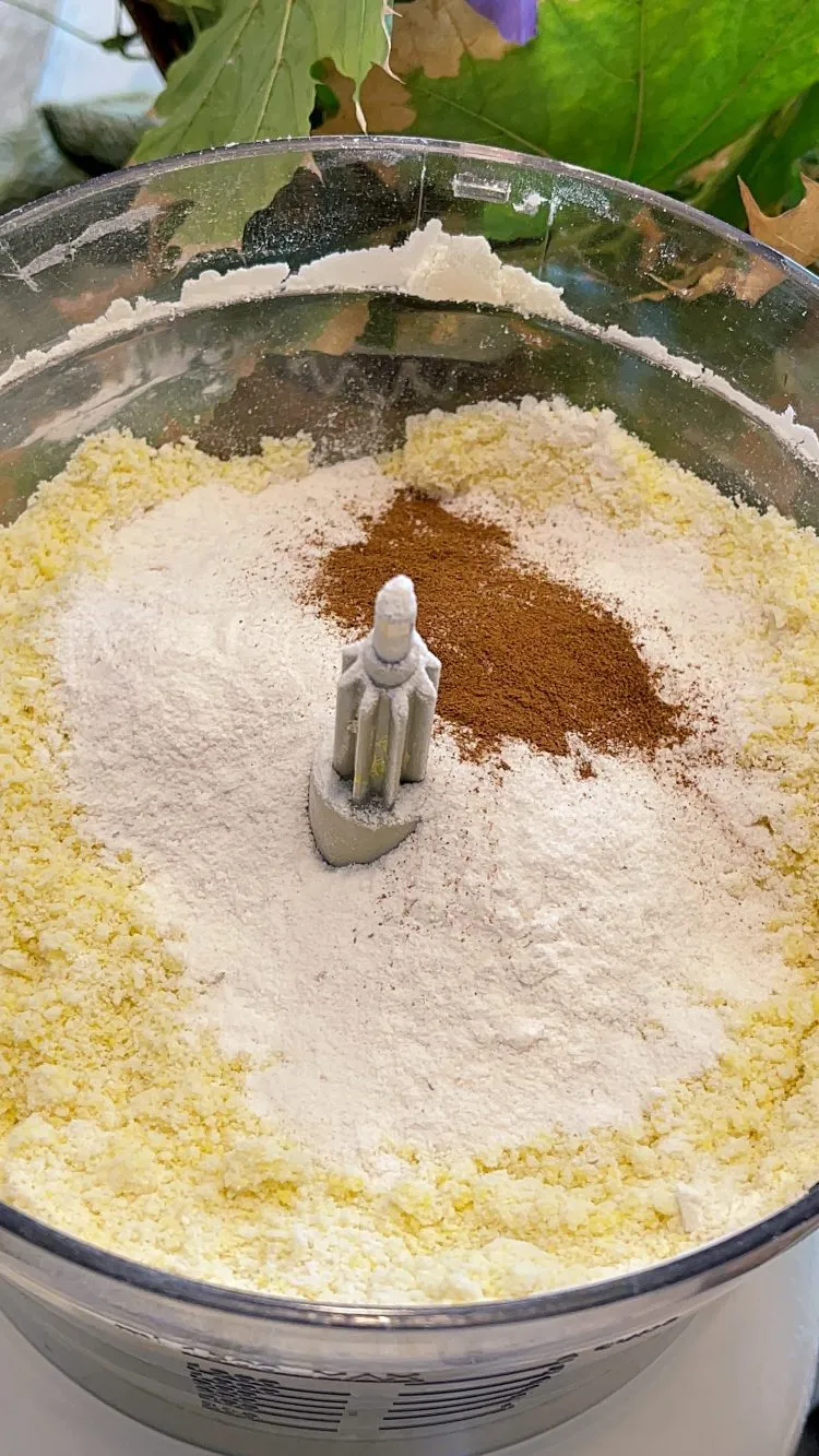 - Pentru început, ne ocupăm de aluat. Trebuie lucrat rapid, pentru că este un aluat de tartă cu unt rece în compoziție. Am ales să folosesc un procesor de bucătărie, dar poți folosi și cuțitul sau un blender manual/pastry cutter. Amestecăm untul cu făina 1–2 minute, până obținem o textură nisipoasă. Adăugăm zahărul pudră, gălbenușurile, apa rece, sarea și scorțișoara și mixăm 2–3 minute, doar până când aluatul începe să se adune.