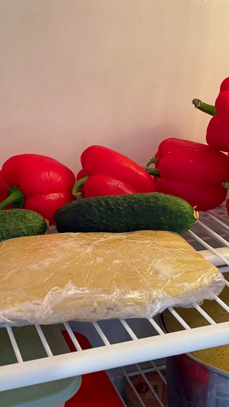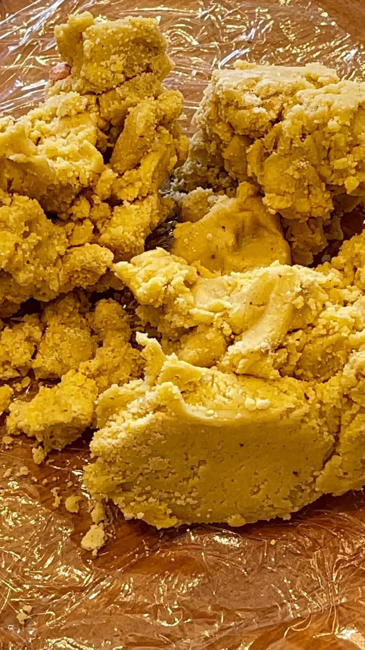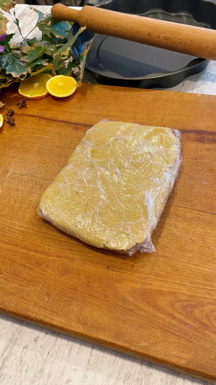 - Scoate aluatul format; chiar dacă la început pare grunjos, nu adăuga făină în plus. Lucrează rapid cu aluatul, formează un disc și învelește-l în folie alimentară. Păstrează-l la frigider cel puțin 30 de minute; poate sta și 1 oră, timp în care particulele de unt se întăresc, iar aluatul va putea fi întins fără să se rupă.