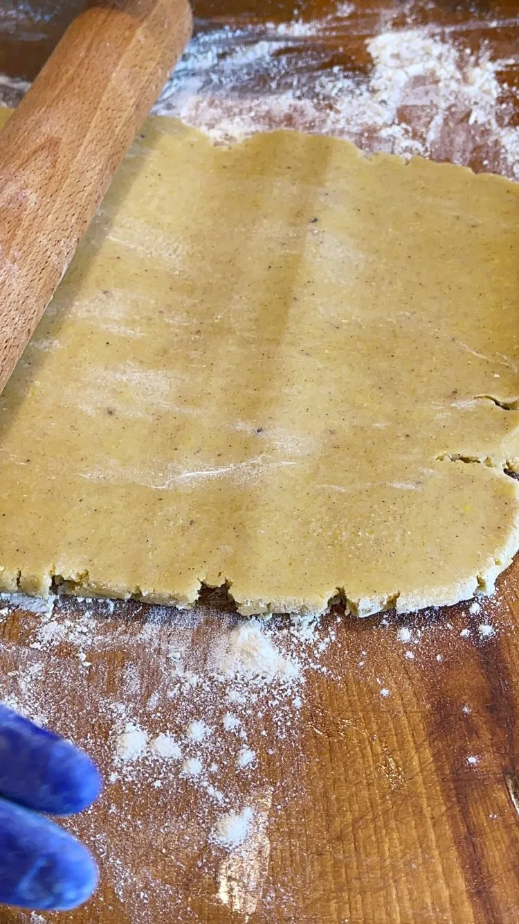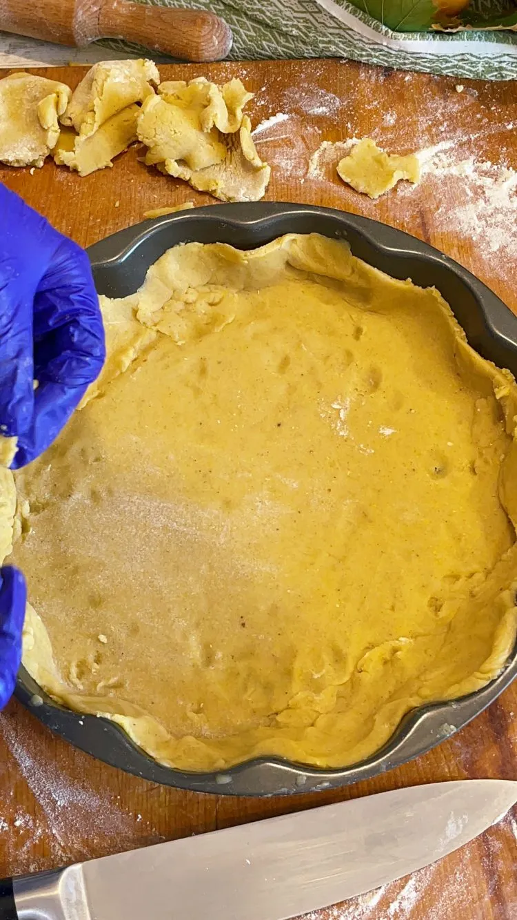 - Scoate aluatul din frigider și îndepărtează folia, apoi înfăinează ușor blatul de lucru și întinde foaia la aproximativ 0,5 cm grosime; ruleaz-o pe sucitor și transfer-o în forma de tartă fără a o unge, deoarece aluatul bogat în unt nu se lipește ușor.