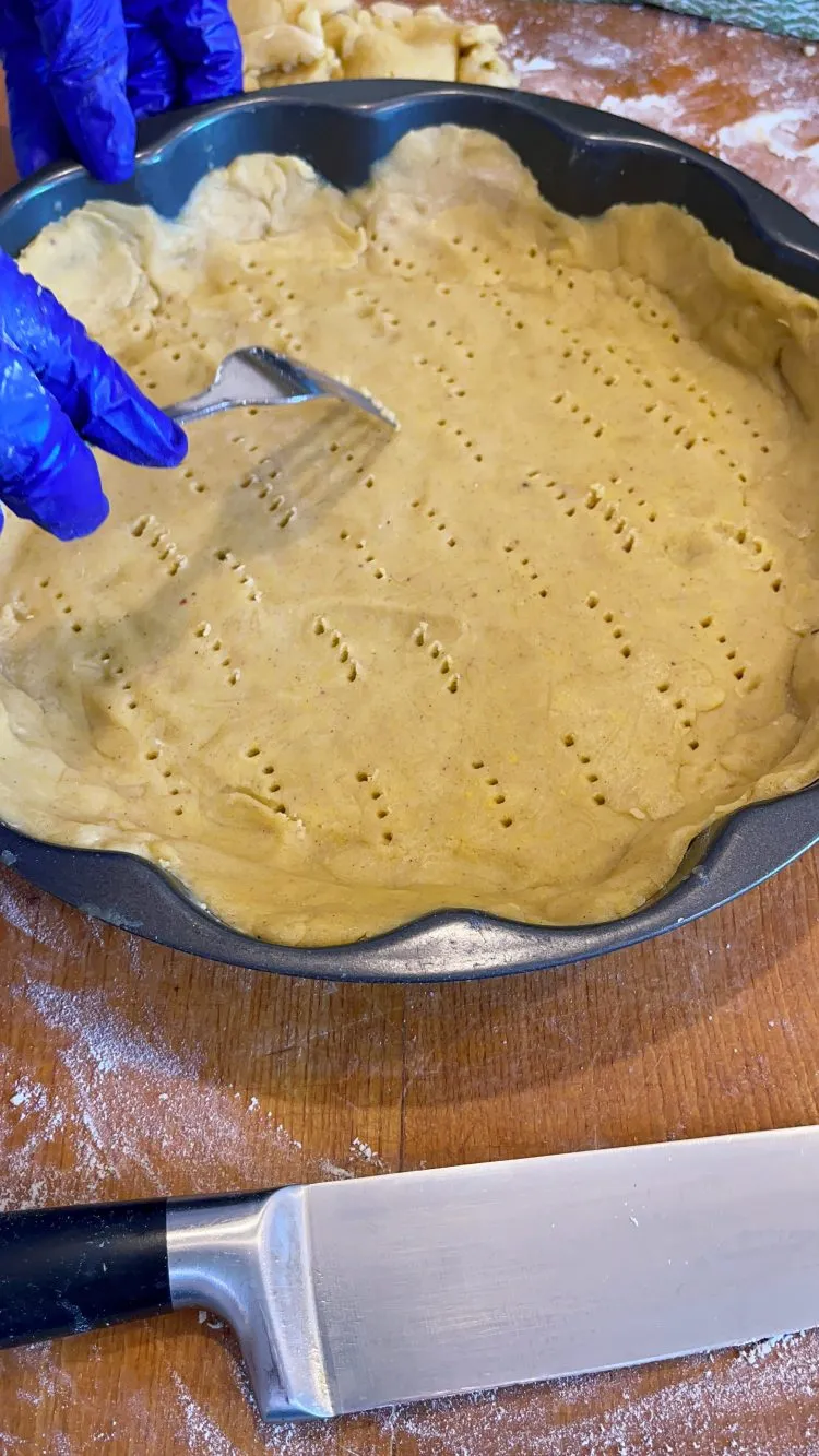 Taie excesul de pe margini și înțeapă baza din loc în loc cu o furculiță, pentru a preveni formarea bulelor și umflarea la copt.