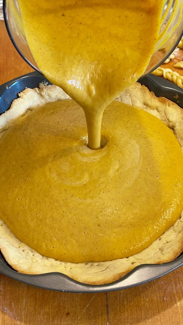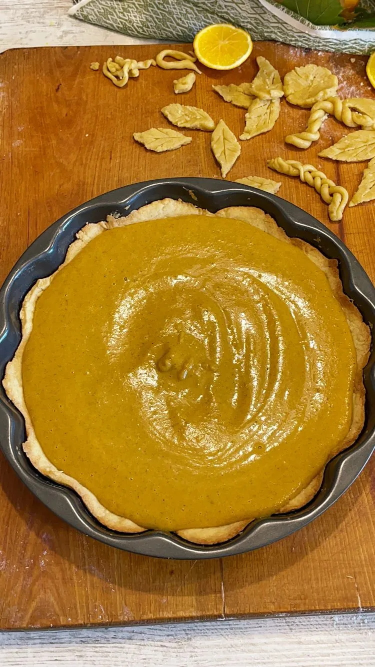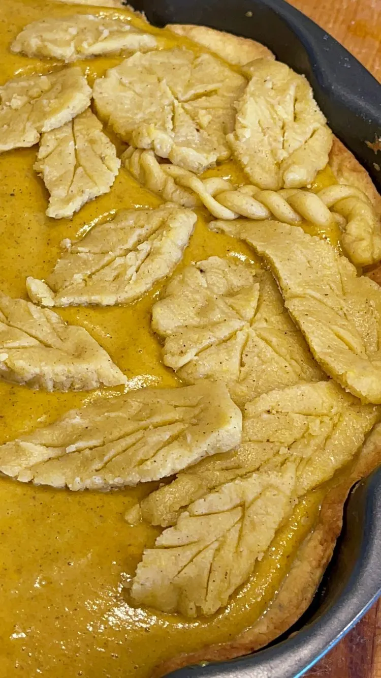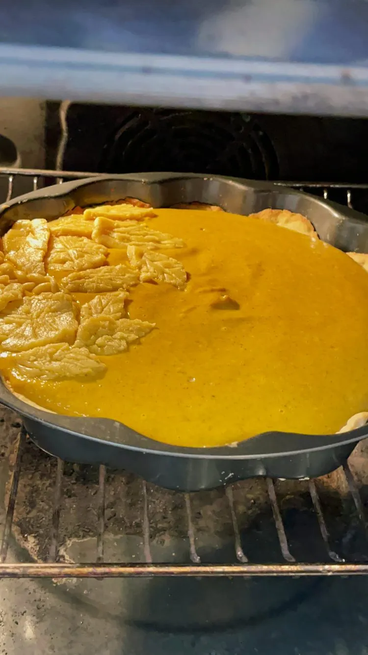 - Pentru umplutură, adaugă toate ingredientele în blender și mixează până obții o consistență fină și aromată; toarnă compoziția peste crusta pre-coaptă și, dacă dorești, decorează cu frunzulițe decupate din aluatul rămas. Coace încă 40–45 de minute, până când marginile sunt setate, iar centrul rămâne ușor „jelly” la mișcare; nu depăși timpul, altfel umplutura va crăpa din cauza supra-coagulării ouălor. Pentru a preveni fisurile, urmărește „fereastra optimă” de coacere și răcește treptat plăcinta după coacere.