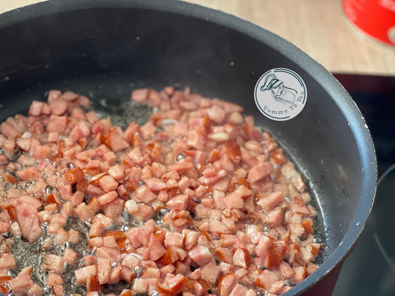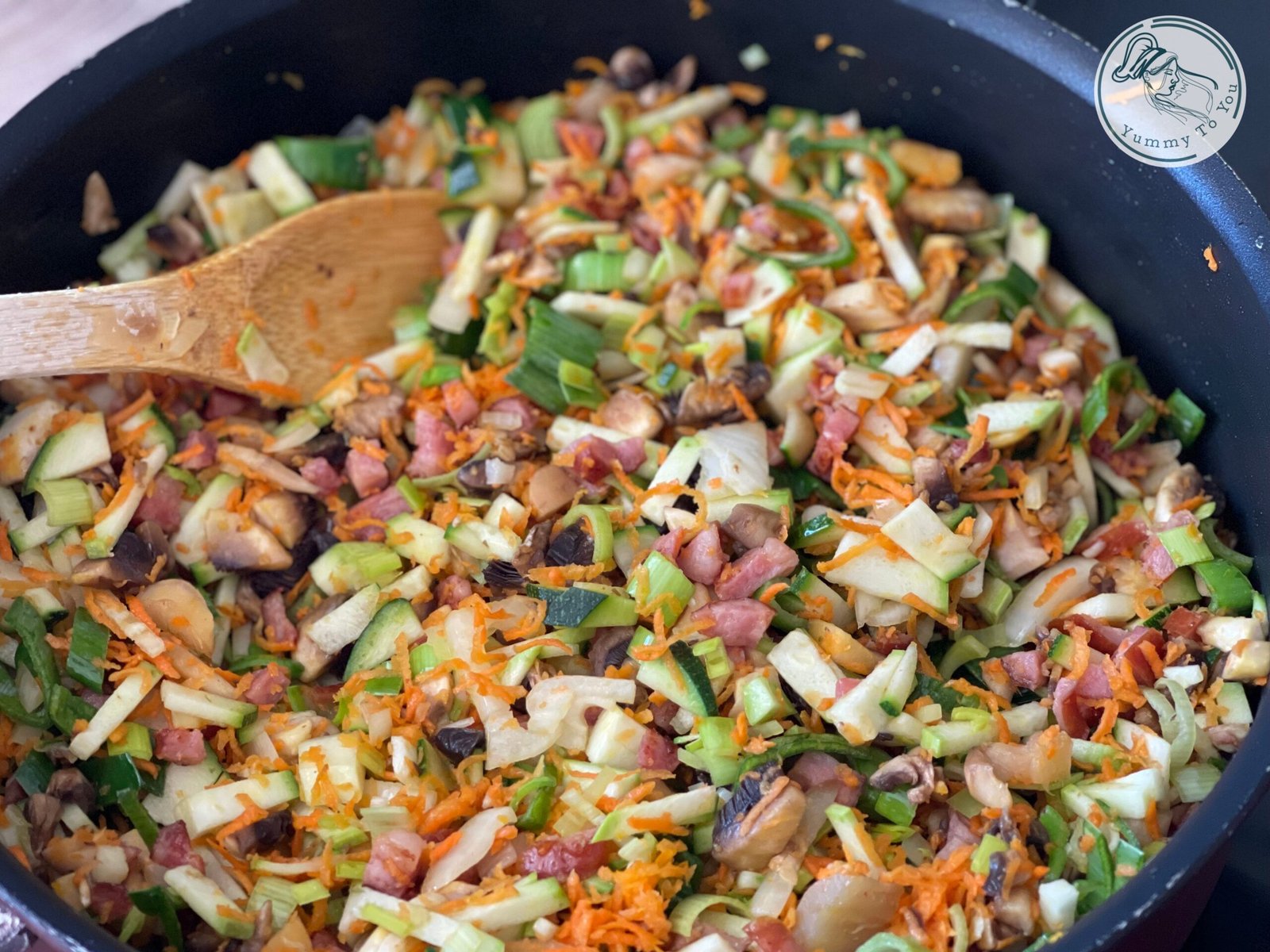 - Am început pregătirea umpluturii pentru sarmale, cu cârnații afumați tocați mărunt, la cuțit, astfel încât să se simtă plăcut în compoziție. I-am rumenit ușor, până au început miroase tare bine in casa. Apoi am adăugat legumele tocate — morcov, dovlecel, praz și ciuperci — continuând să le gătesc până s-au înmuiat și s-au combinat frumos cu aroma cârnaților.