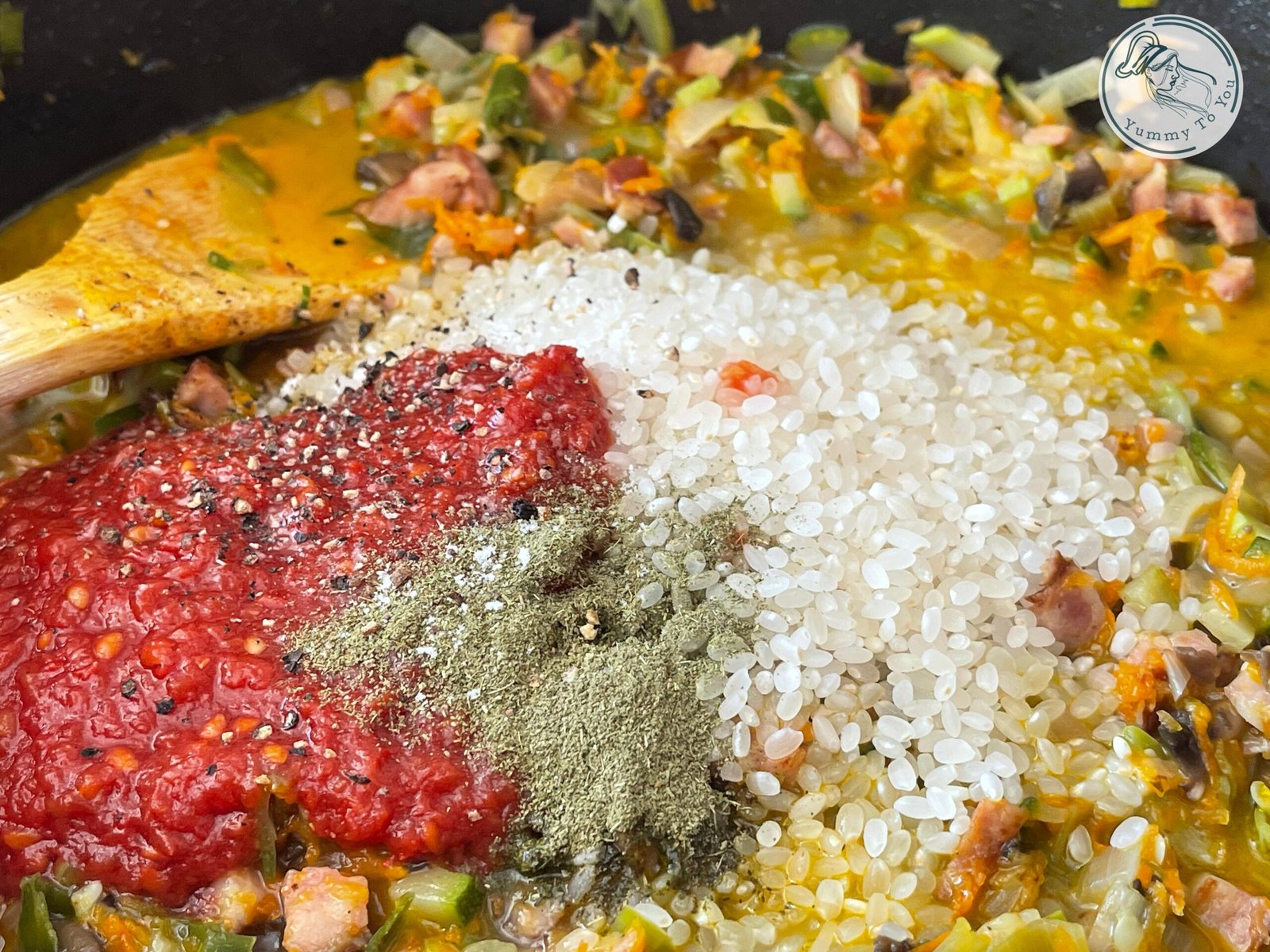 - Umplutura arată deja absolut minunat: culori vii, arome bogate și prospețime de legume. Dar pentru a obține consistența perfectă pentru umplut sarmalele, mai avem un pas micuț. Legumele trebuie gătite până se înmoaie bine. Cum am făcut asta? Simplu: am adăugat apă treptat, până s-au fiert uniform, iar spre final am incorporat orezul și sosul de roșii, asezonând cu condimente după gust. Am fiert totul până când orezul a „înflorit”, aproximativ 5–7 minute, apoi am lăsat umplutura să se răcească.