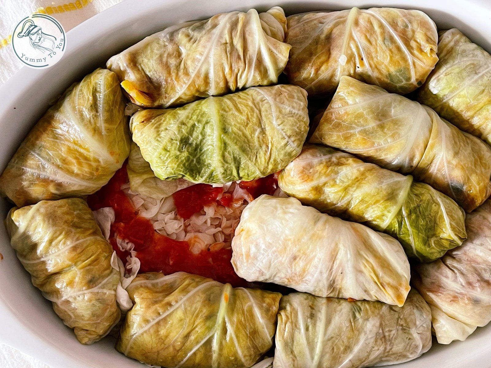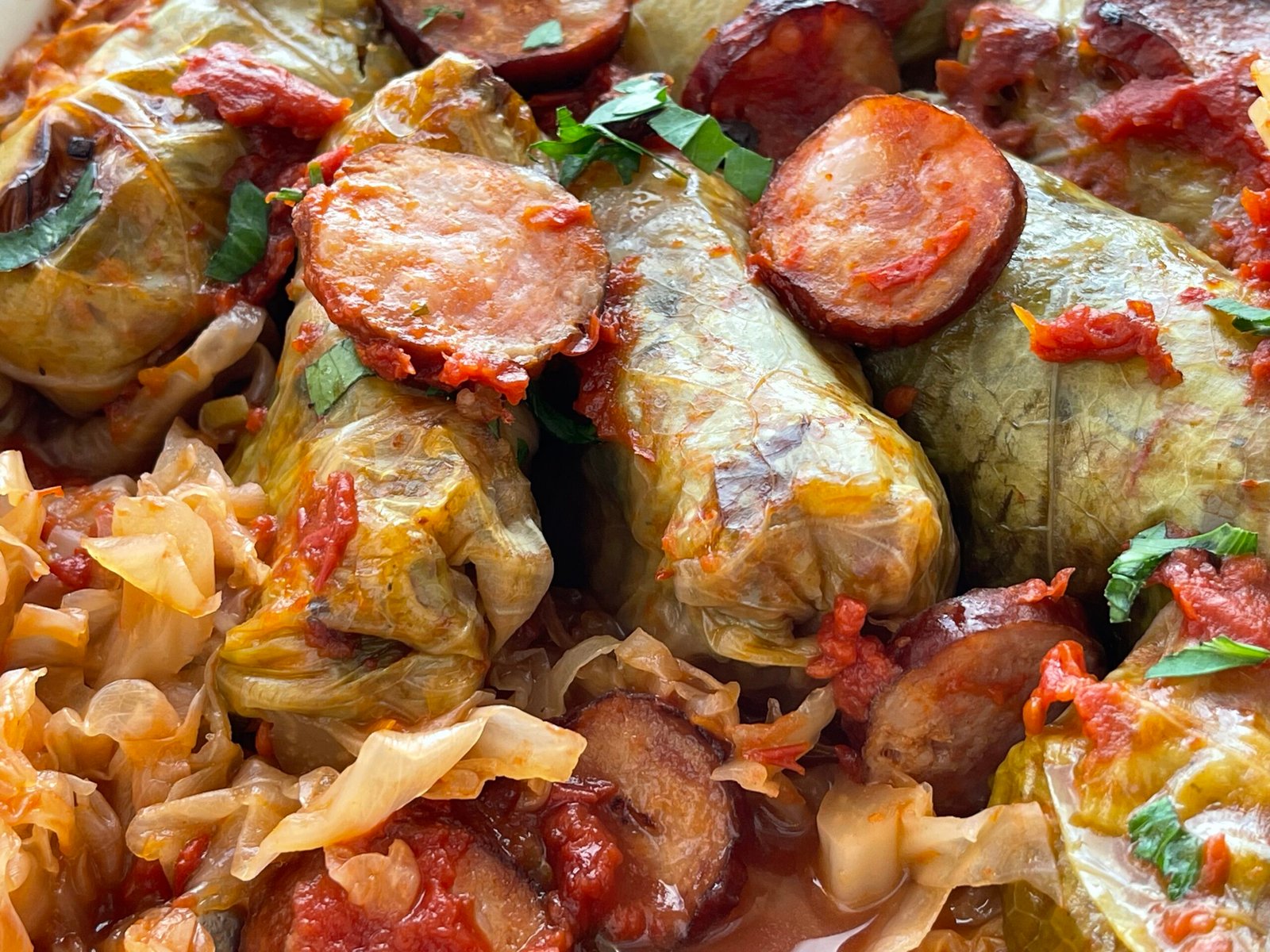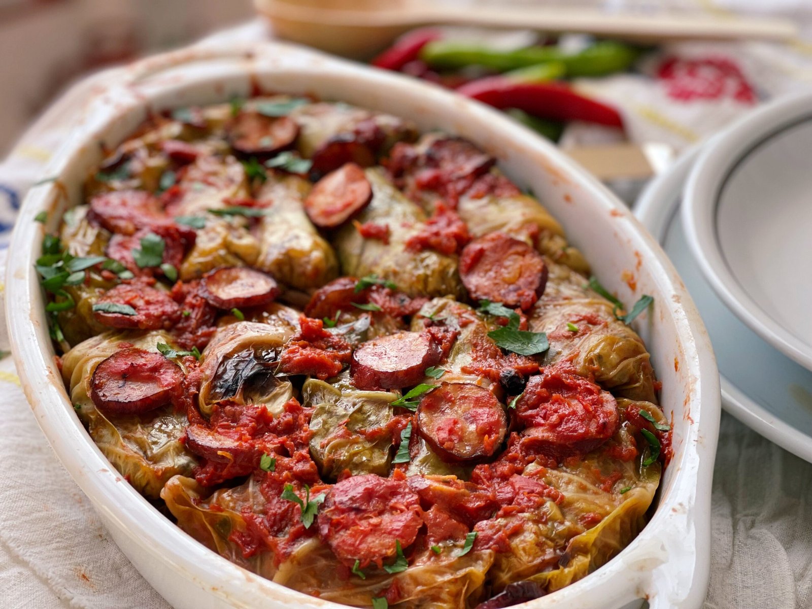 - Pe fundul unui vas termorezistent am așternut varza tocata mărunt și o parte din sosul de roșii amestecat cu puțină apă. Am format pe rând sarmalele și le-am așezat in vas, iar printre ele am strecurat foi de dafin, câteva boabe de piper și felii de cârnați, pentru aromă și savoare suplimentară. Deasupra am turnat sosul de roșii rămas și am completat cu apă, până când sarmalele aproape că au fost acoperite, pregătite să fiarbă încet și să absoarbă toate aromele.