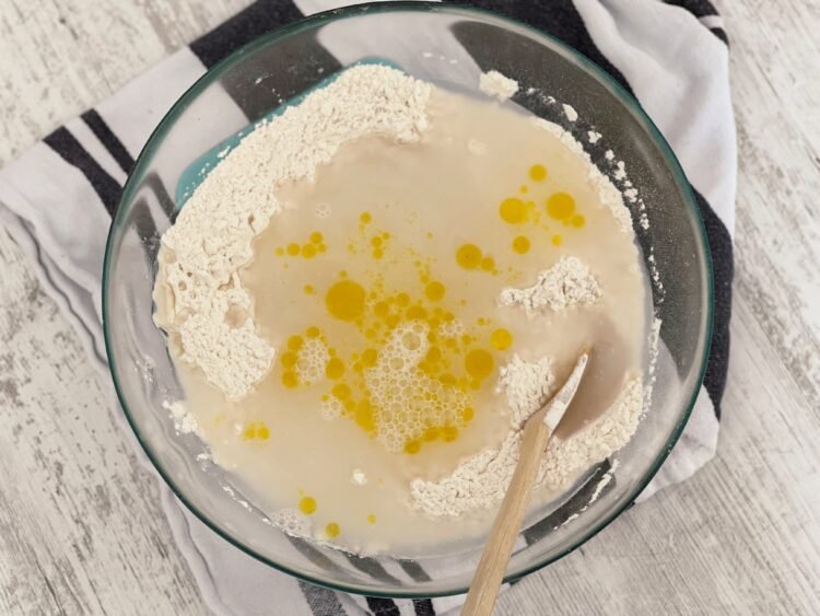 După ce tocănița era aproape gata, m-am apucat de pâine. Am dizolvat drojdia în apa călduță și am lăsat-o câteva minute, până a început să facă bule la suprafață. Într-un bol mare, am amestecat făina cu sarea, apoi am adăugat apa cu drojdia și uleiul de măsline. Aluatul era moale și ușor lipicios; am făcut trei serii de „stretch and fold” până am obținut consistența perfectă pentru pâinile rustice.