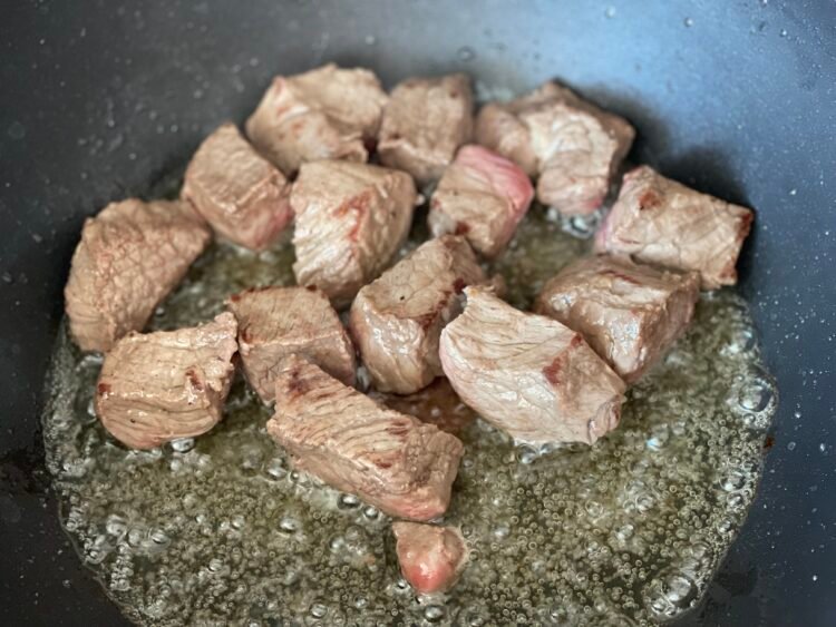 Am pus uleiul de măsline la încins, apoi am adăugat bucățile de vită și le-am rumenit în tranșe, pe toate părțile, până au prins o crustă frumoasă, aurie. Le-am scos pe o farfurie și le-am lăsat deoparte, ca să-și păstreze suculența.