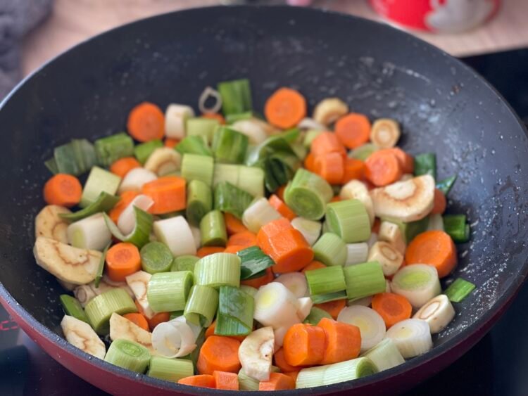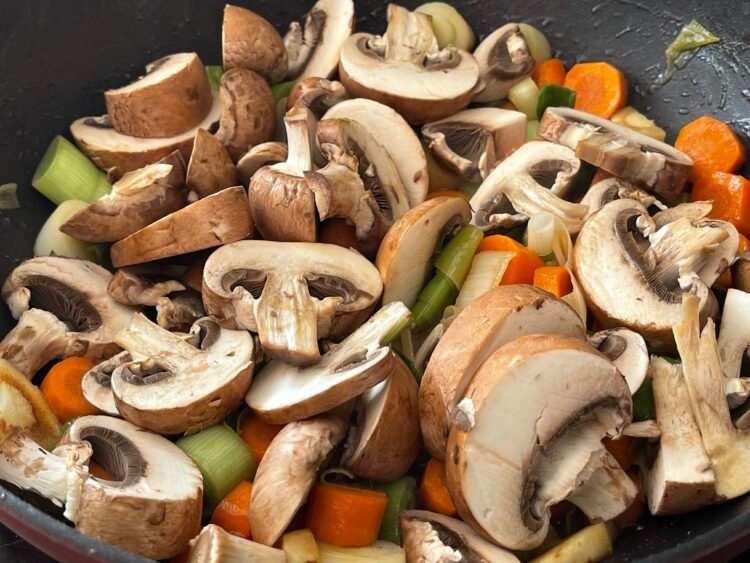 - În același vas am pus prazul tăiat rondele, usturoiul zdrobit, pastarnacul și morcovii feliați. Am lăsat totul să se călească la foc potrivit cam 5–6 minute, până legumele s-au înmuiat și și-au dezvăluit aromele. Apoi am adăugat ciupercile și am mai gătit câteva minute, până au lăsat puțină zeamă.