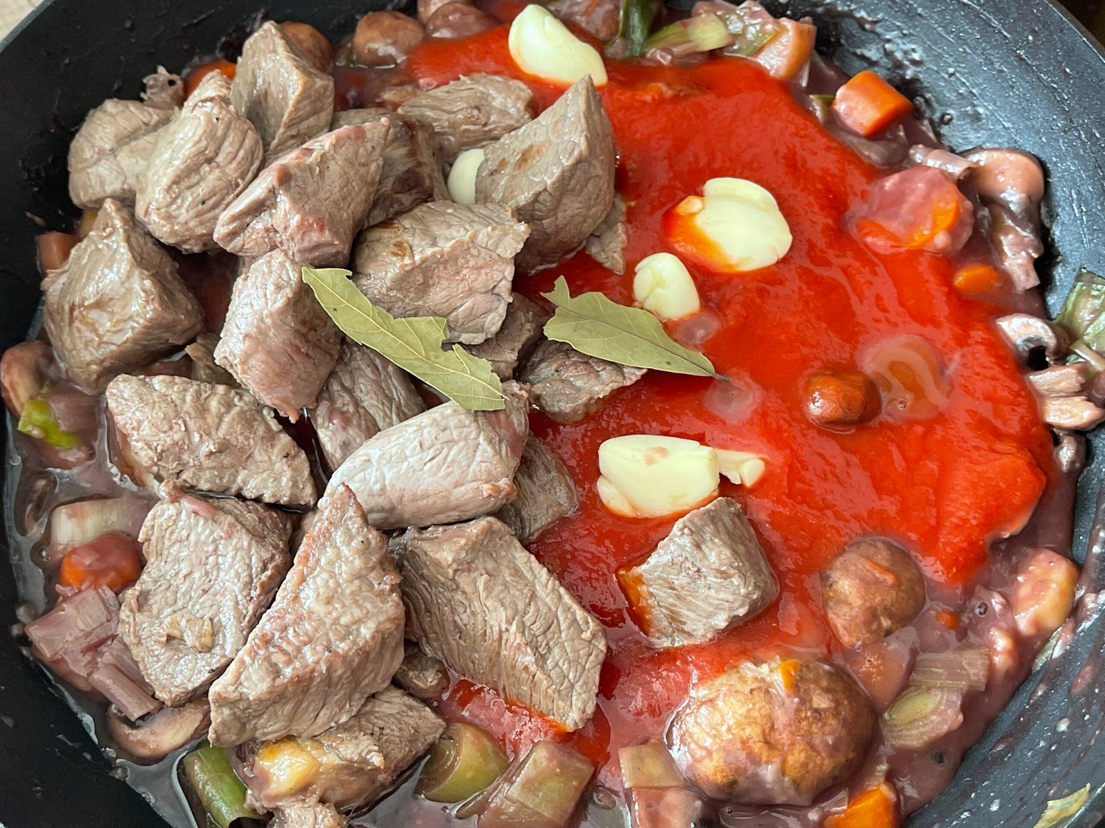 - Am presărat o lingură de făină peste legume și am amestecat bine, apoi am turnat vinul roșu. L-am lăsat să fiarbă ușor 2–3 minute, doar cât să se evapore alcoolul și să rămână aroma bogată, ușor dulceagă, a vinului. Apoi am adăugat înapoi carnea, sosul de roșii, frunza de dafin și supa fierbinte. Am asezonat cu sare și piper, am redus focul și am acoperit parțial cratița.