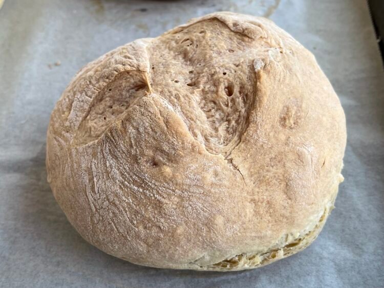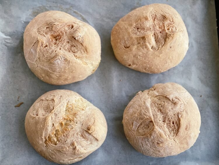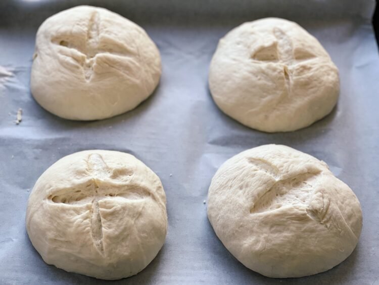 - După ce aluatul a crescut frumos, l-am împărțit în patru părți egale și am modelat patru bile rotunde, pe care le-am așezat într-o tavă tapetată cu hârtie de copt. Le-am mai lăsat să se odihnească 30 de minute, le-am crestat ușor în cruce deasupra, apoi le-am copt în cuptorul preîncălzit la 220°C, timp de 25–30 de minute, până s-au rumenit frumos.