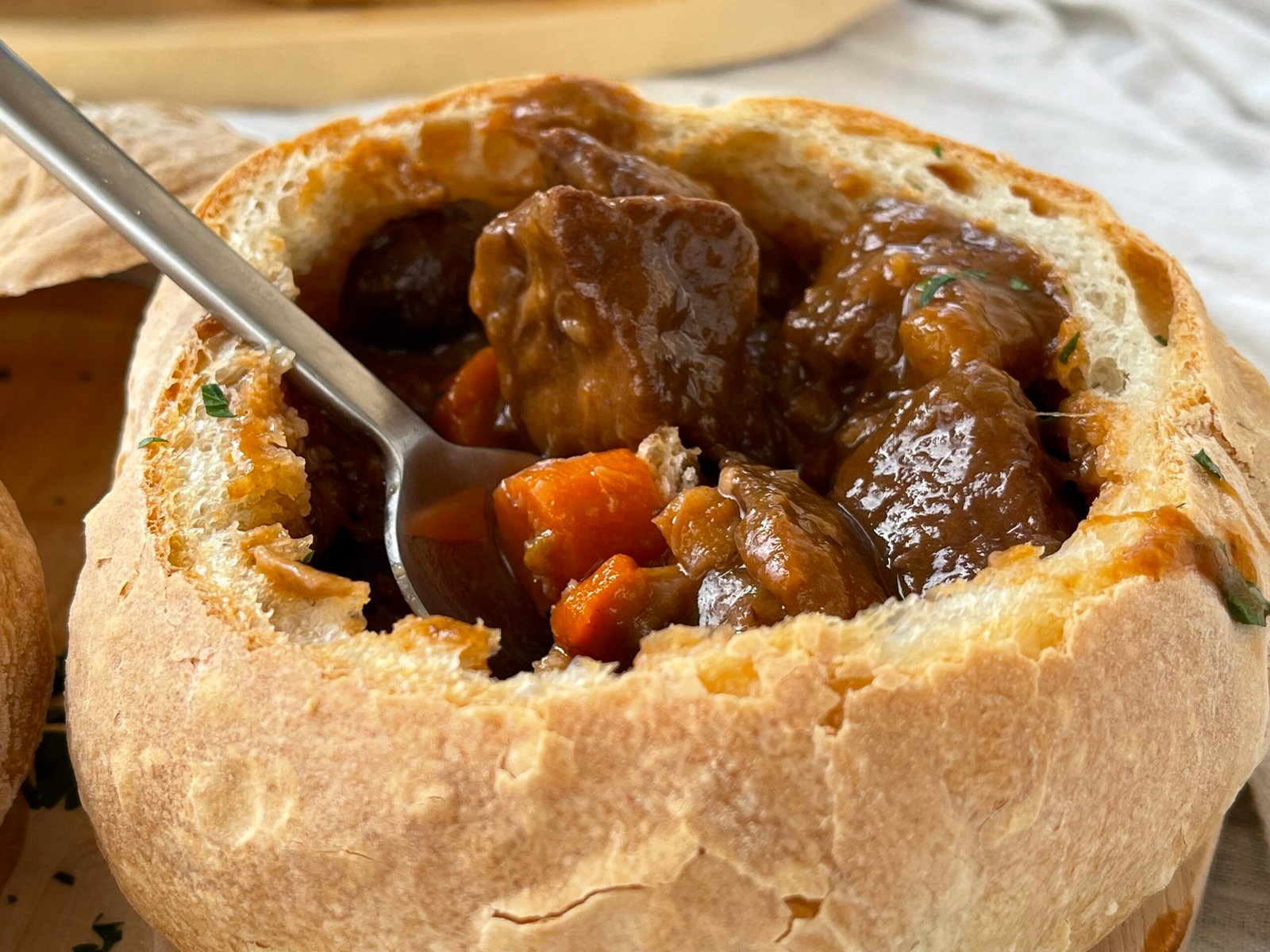 Tocăniță de vită cu vin roșu, servită în pâine rustică – Cazanul Vrăjitoarei