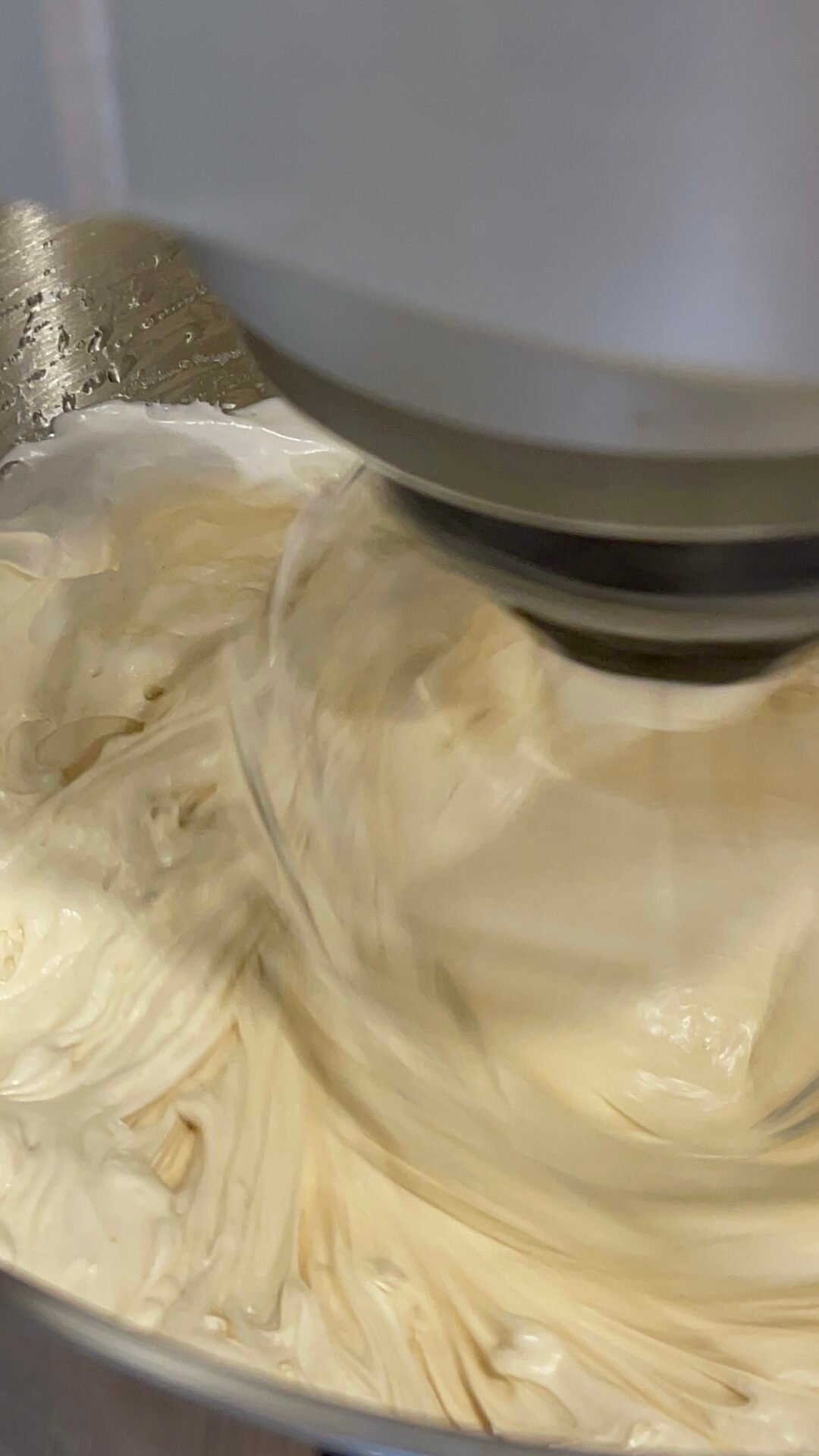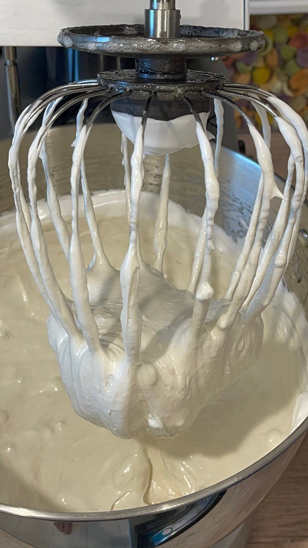 - I poured the hot mixture into the bowl of the food processor and left it to beat for 18-20 minutes at maximum speed until it cooled down. At first it looks like a fluid and yellowish foam, and at the end I got a white foam, dense and firm, slightly warm.