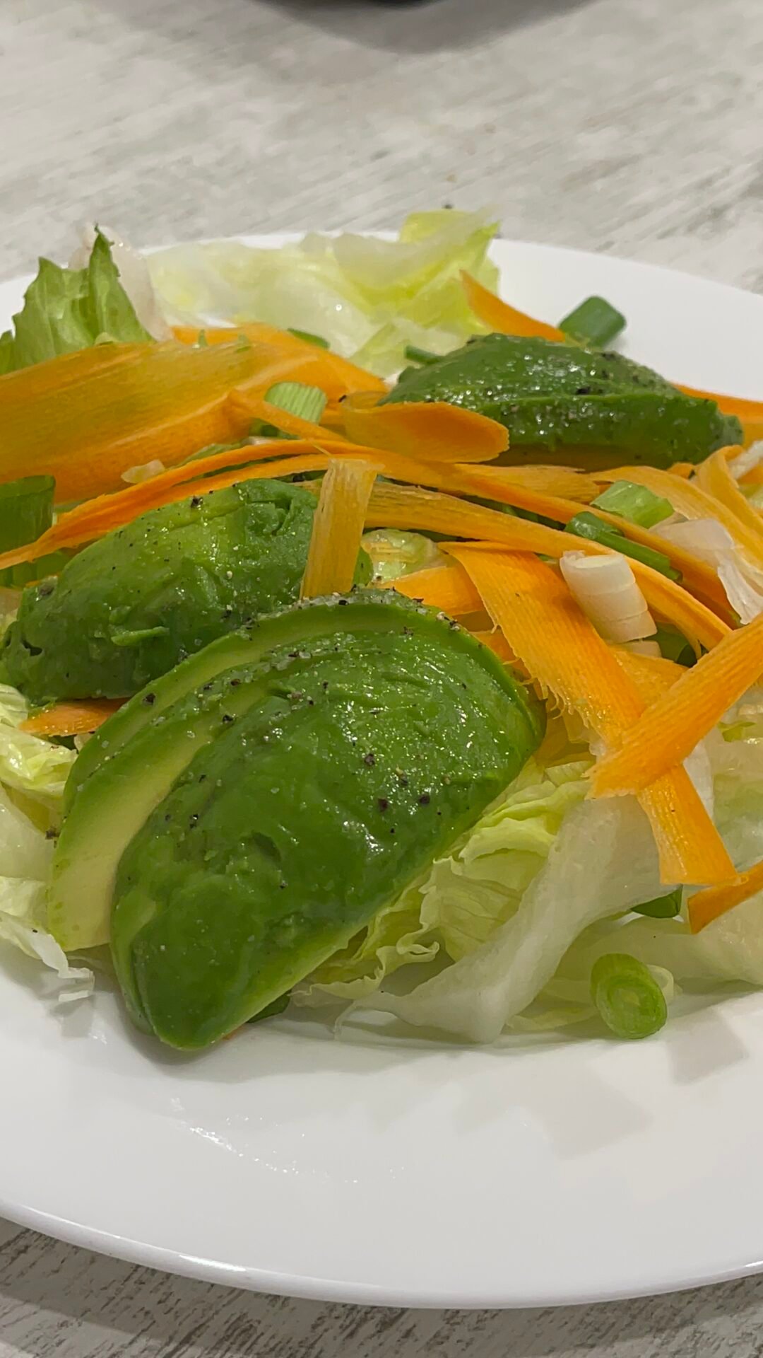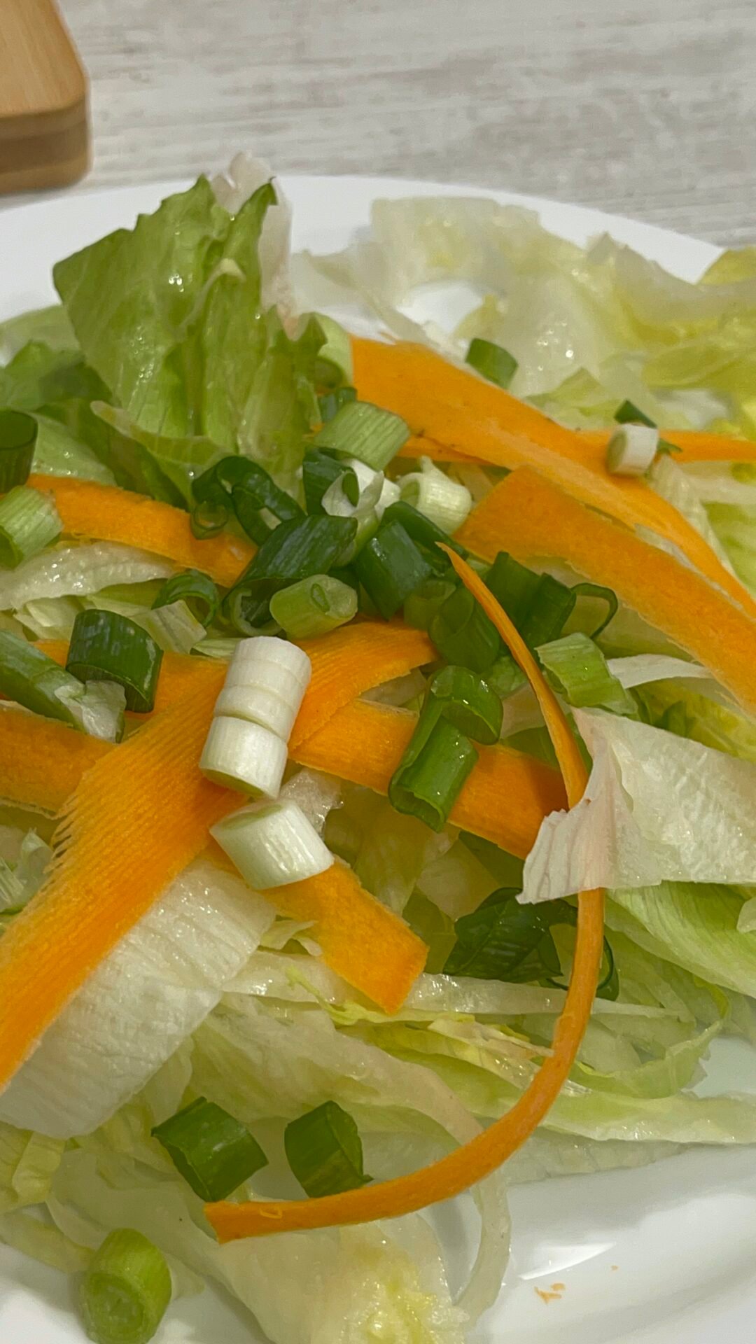 - Use a vegetable peeler to slice the carrot. Place the carrot slices over the salad. Finely chop the green onion and add it to the plate with the salad. You can also replace the green onion with red or white onion, according to your preferences.