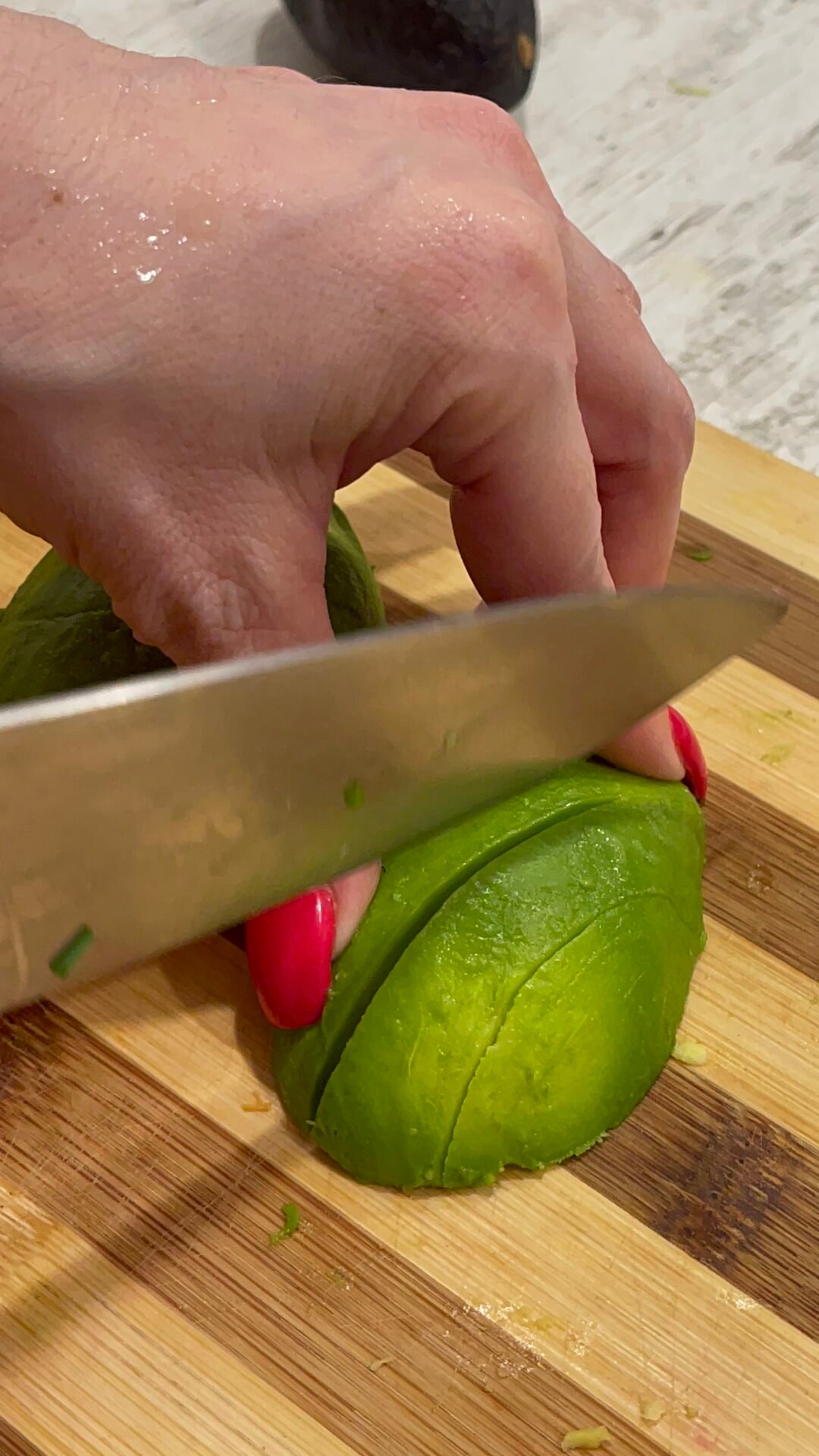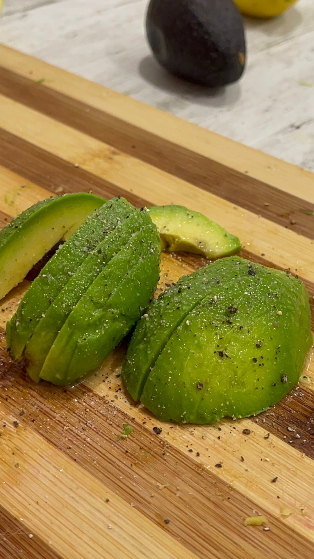 - Next we deal with avocados. Cut it in half, remove the seed and cut it into slices. Sprinkle the avocado slices with lemon juice, add salt and pepper and then arrange the slices nicely on top of our salad. The creamy texture of the avocado will combine perfectly with the rest of the ingredients in the salad, so it is important not to remove it from the salad.