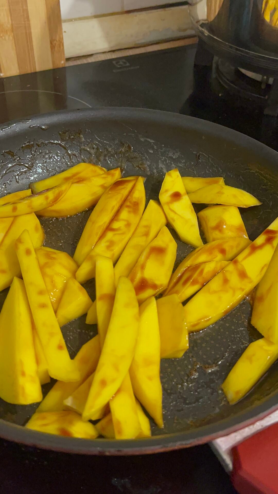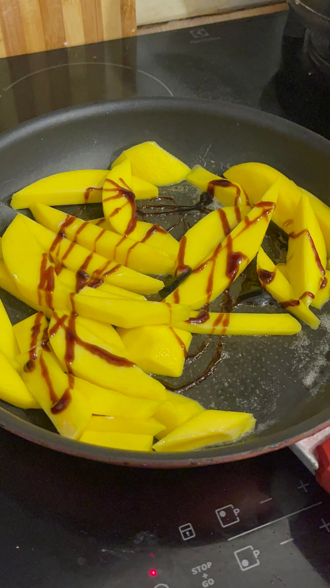 - Finally, we move on to the star of this salad: the mango. Over time, I learned to use it in various types of dishes, both sweet and salty. Giving it a slightly caramelized taste, I knew it would fit like a glove in my chicken salad. So, I peeled the mango and then cut it into slices that I sprinkled with lemon juice. In a pan, melt the butter and add the mango slices. Carefully move the pan until the mango slices are coated in butter. Add 1 tablespoon of balsamic vinegar over and mix gently. Keep on low to medium heat for 2-3 minutes, then leave the pan aside.